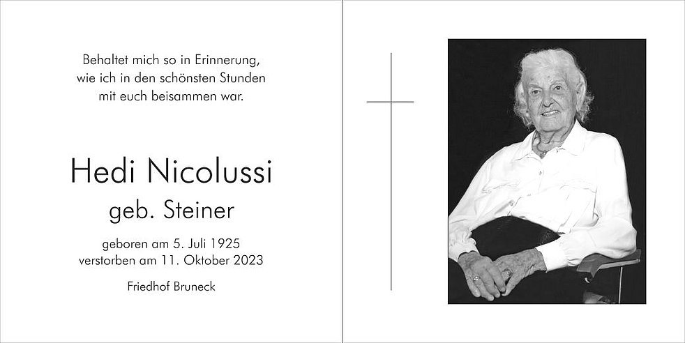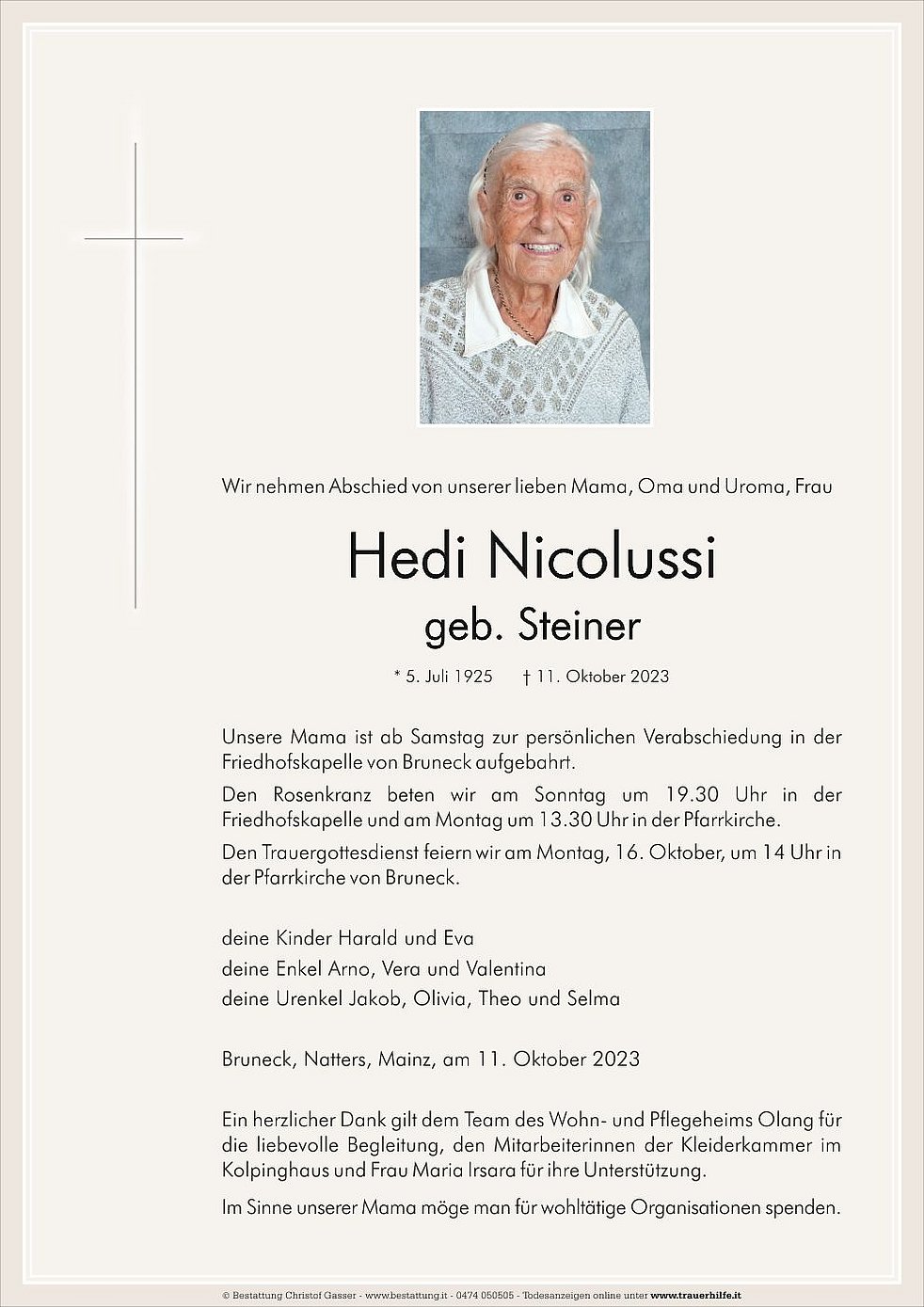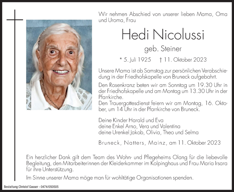 Unsere Mama ist ab Samstag zur persönlichen Verabschiedung in der Friedhofskapelle von Bruneck aufgebahrt.
