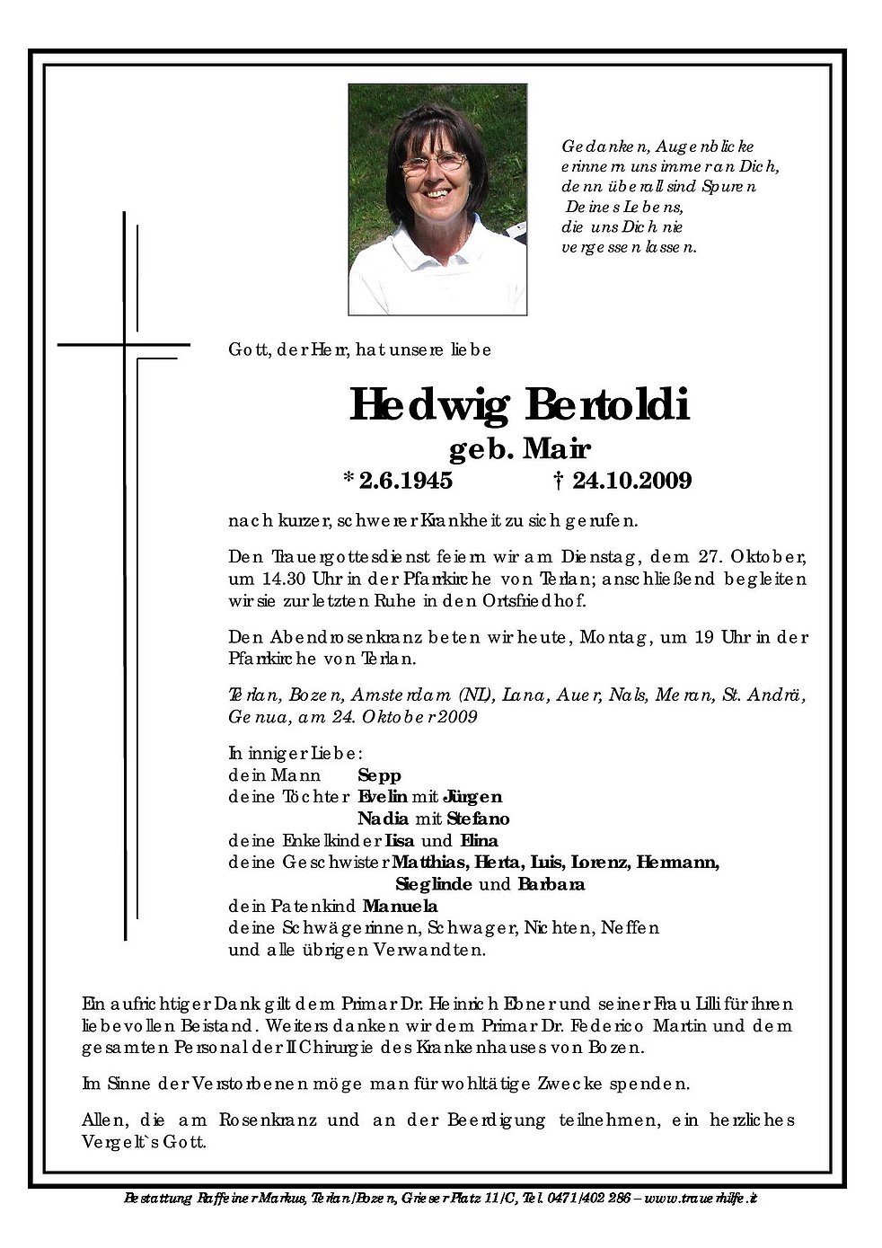 Den Trauergottesdienst feiern wir am Dienstag, dem 27. Oktober, um 14.30 Uhr in der Pfarrkirche von Terlan; anschließend begleiten wir sie zur letzten Ruhe in den Ortsfriedhof.
