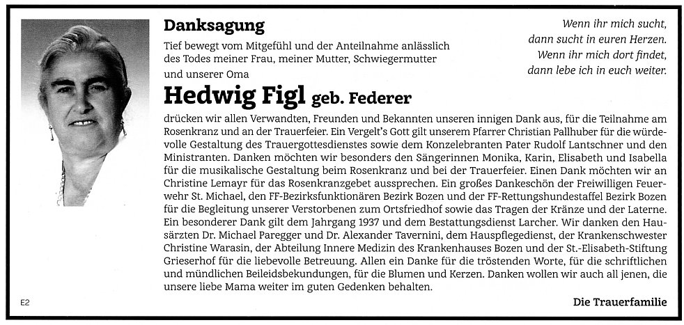 Wir danken den Hausärzten Dr Michael Paregger und Dr. Alexander Tavernini, dem Hauspflegedienst, der Krankenschwester Christine Warasin, der Abteilung Innere Medizin des Krankenhauses Bozen und St. Elisabeth- Stiftung Grieserhof für die liebevolle Betreuung.