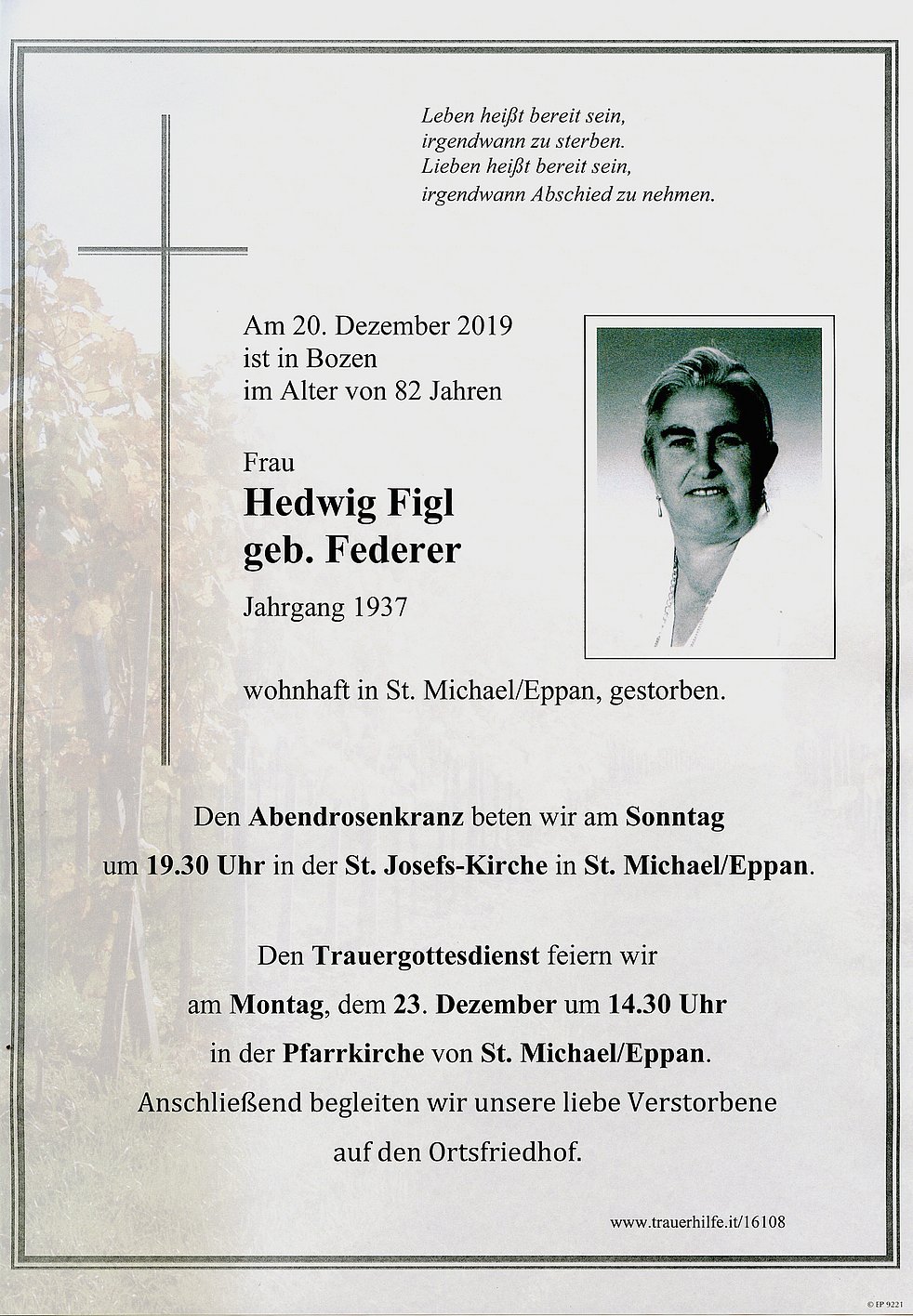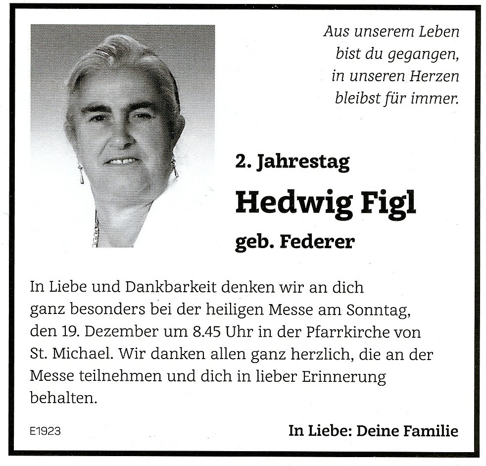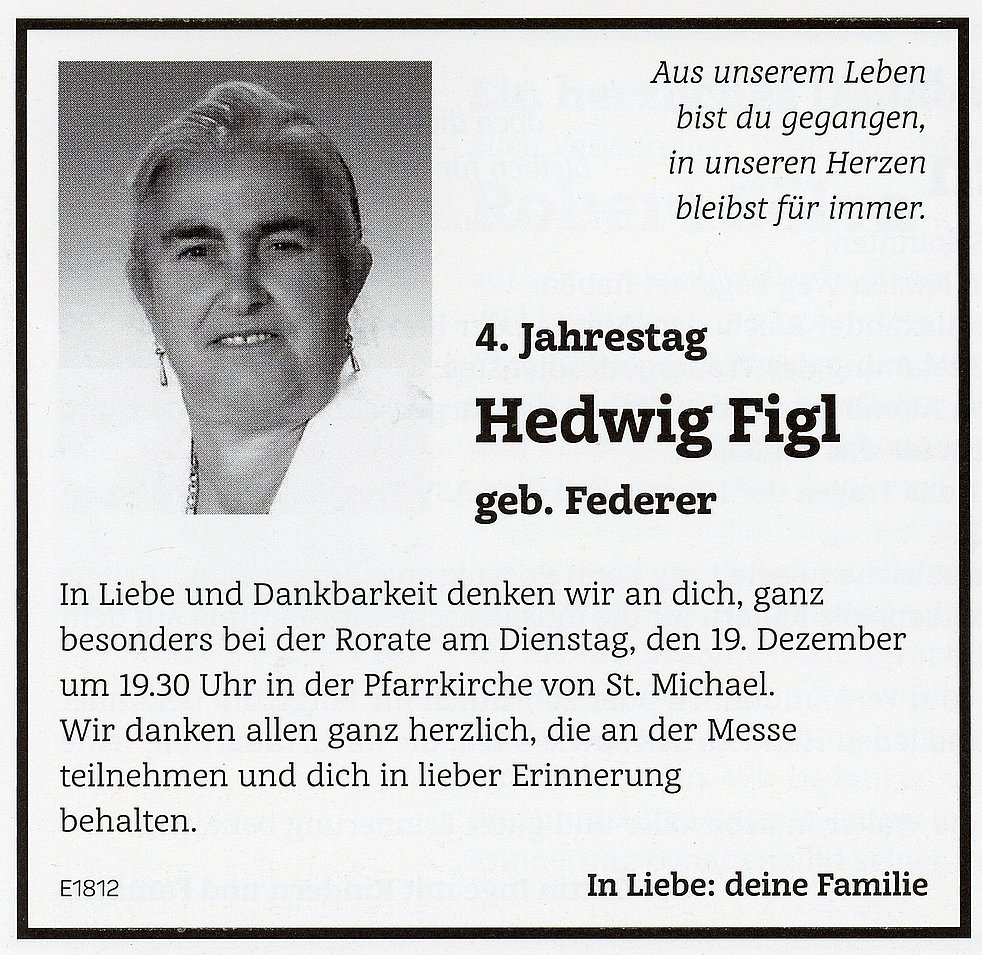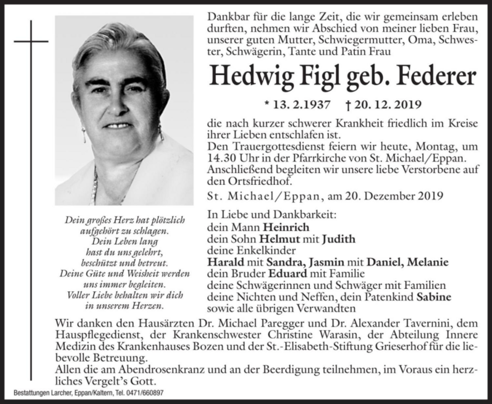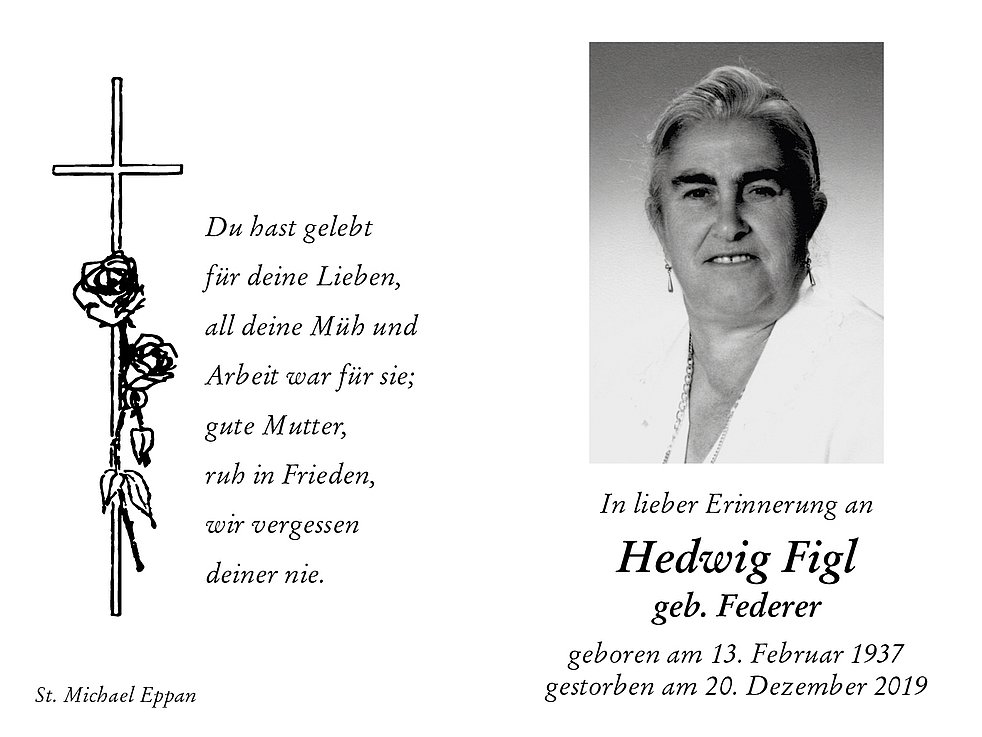 Den Trauergottesdienst feiern wir am Montag, dem 23. Dezember um 14.30 Uhr in der Pfarrkirche von St. Michael/Eppan.
