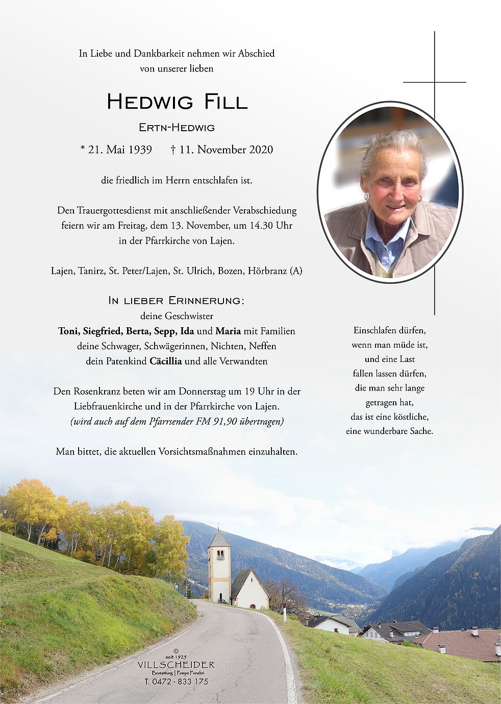 Trauerfeier: 13.11. - 14:30 Uhr Lajen