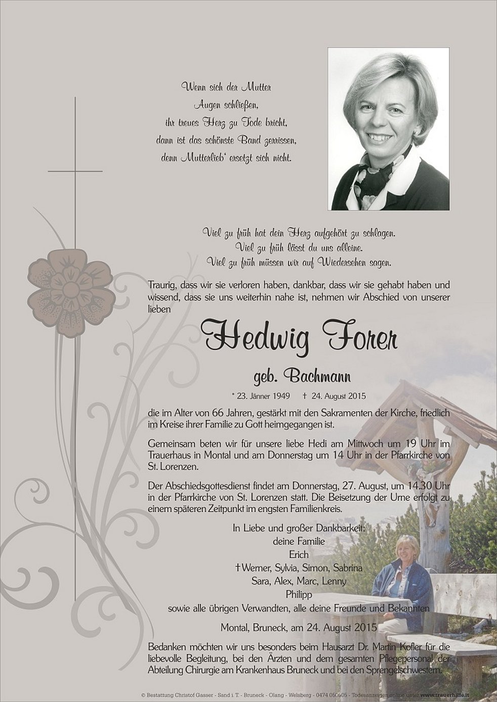 Bedanken möchten wir uns besonders beim Hausarzt Dr. Martin Kofler für die liebevolle Begleitung, bei den Ärzten und dem gesamten Pflegepersonal der Abteilung Chirurgie am Krankenhaus Bruneck und bei den Sprengelschwestern.