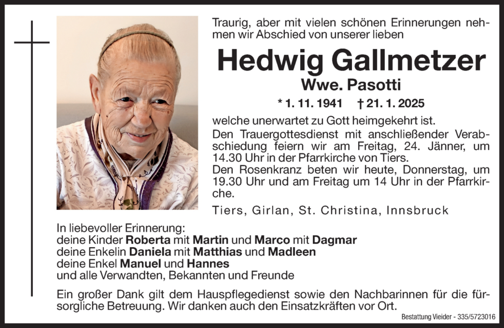 Den Trauergottesdienst mit anschließender Verabschiedung feiern wir am Freitag, 24. Jänner, um 14.30 Uhr in der Pfarrkirche von Tiers.