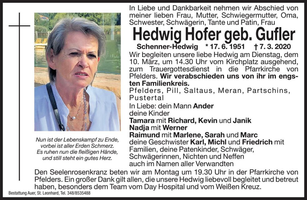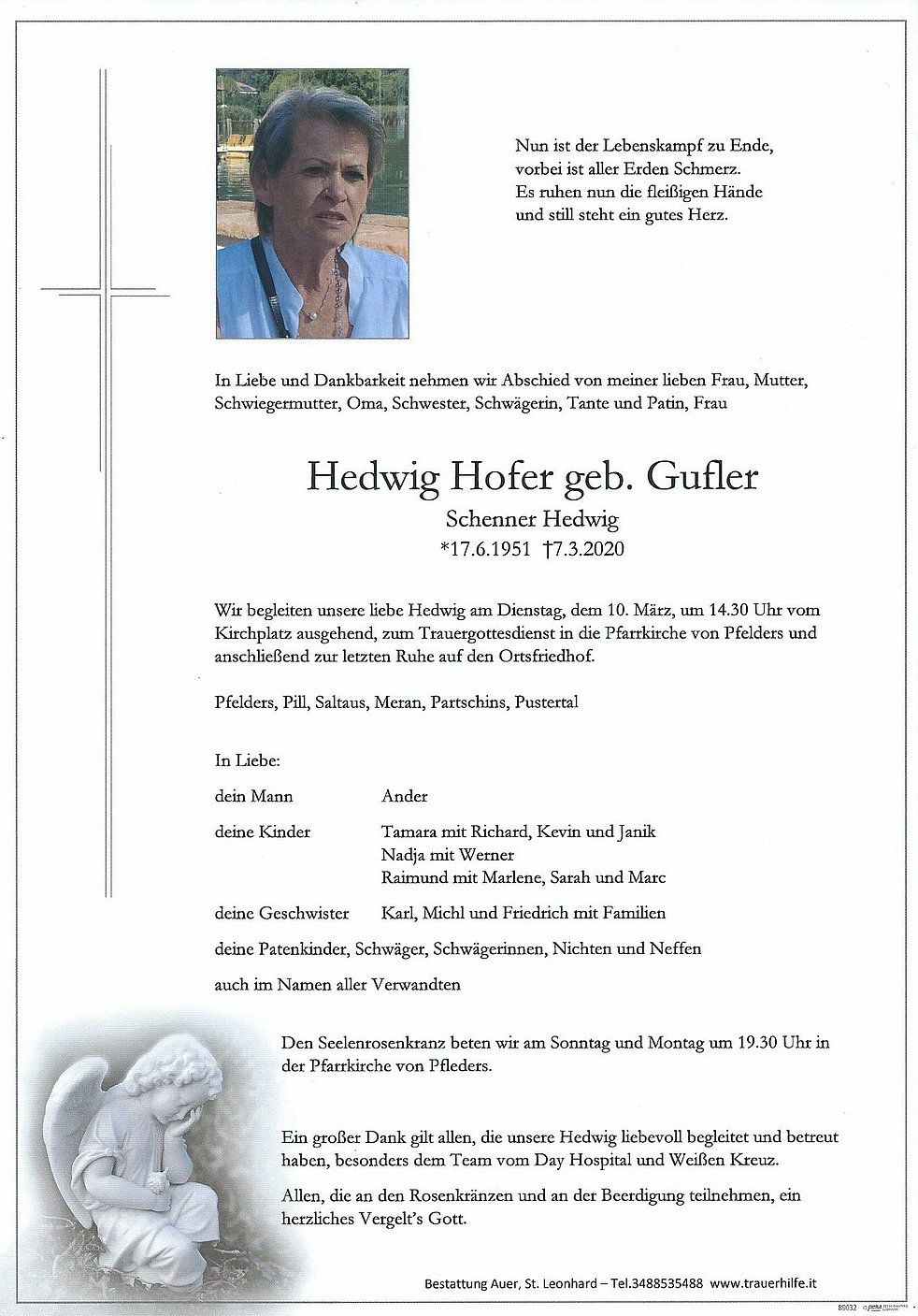 Wir begleiten unsere liebe Hedwig am Dienstag, dem 10. März, um 14.30 Uhr vom Kirchplatz ausgehend, zum Trauergottesdienst in die Pfarrkirche von Pfelders. Wir verabschieden uns von ihr im engsten Familienkreis.
