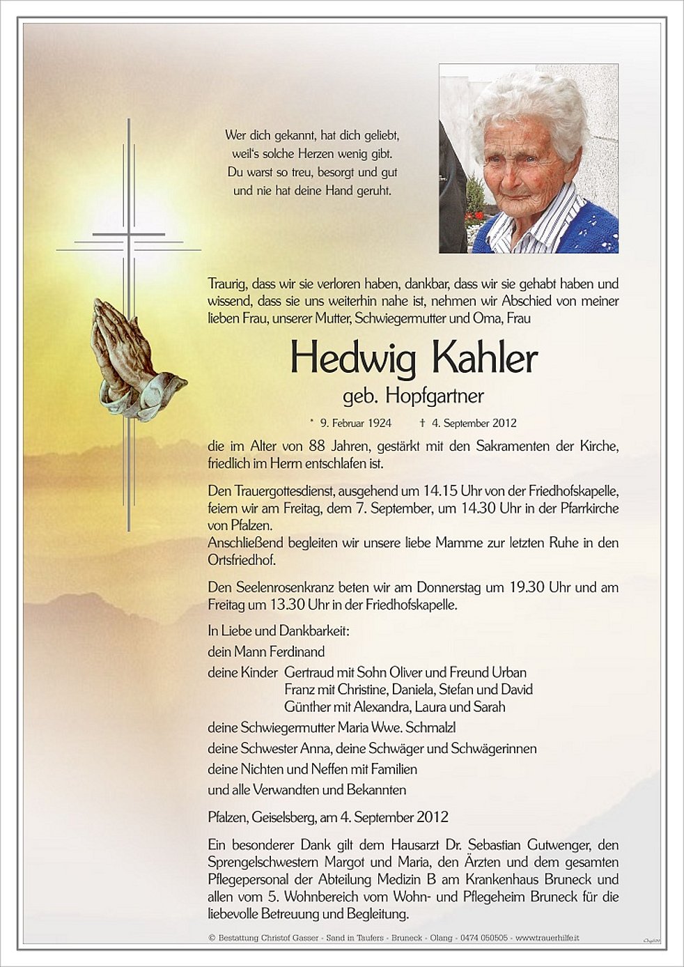 Ein besonderer Dank gilt dem Hausarzt Dr. Sebastian Gutwenger, den Sprengelschwestern Margot und Maria, den Ärzten und dem gesamten Pflegepersonal der Abteilung Medizin B am Krankenhaus Bruneck und allen vom 5. Wohnbereich vom Wohn- und Pflegeheim Bruneck für die liebevolle Betreuung und Begleitung.