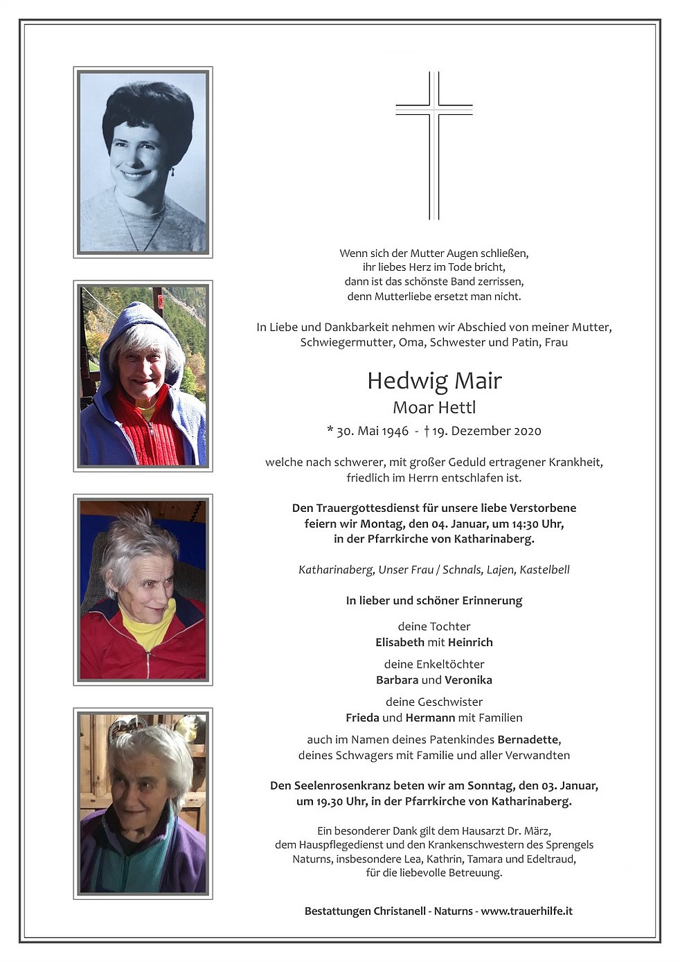 Den Trauergottesdienst für unsere liebe Verstorbene feiern wir Montag, den 04. Januar, um 14:30 Uhr, in der Pfarrkirche von Katharinaberg.