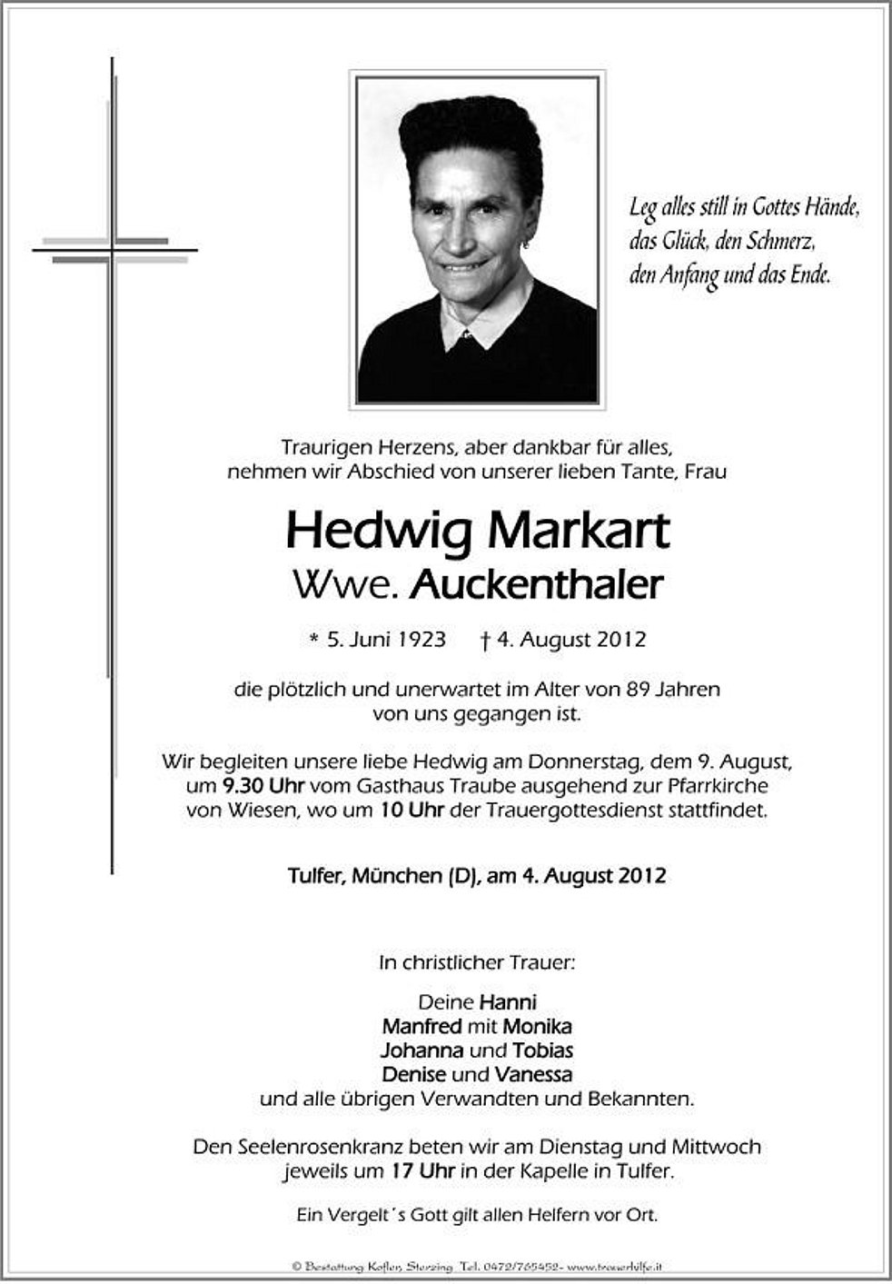 Wir begleiten unsere liebe Hedwig am Donnerstag, dem 9. August,