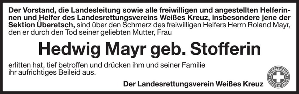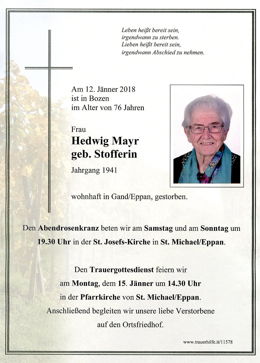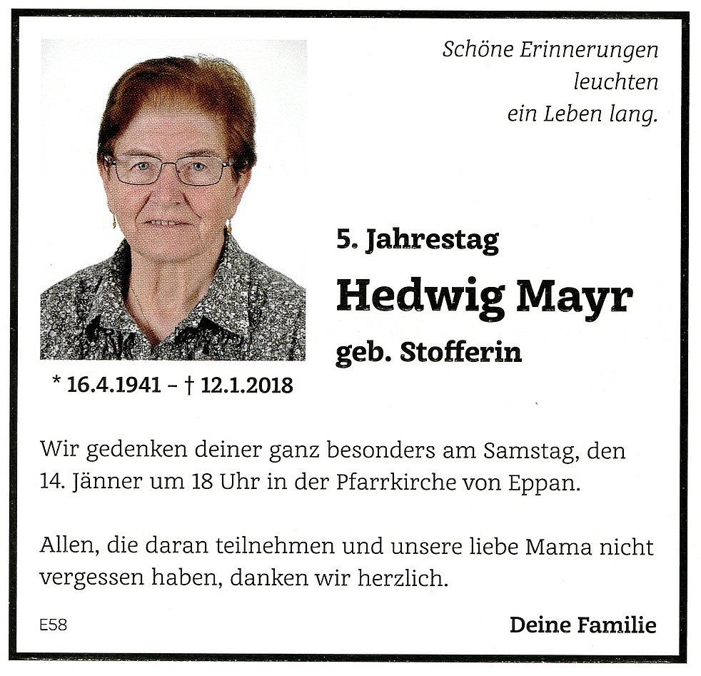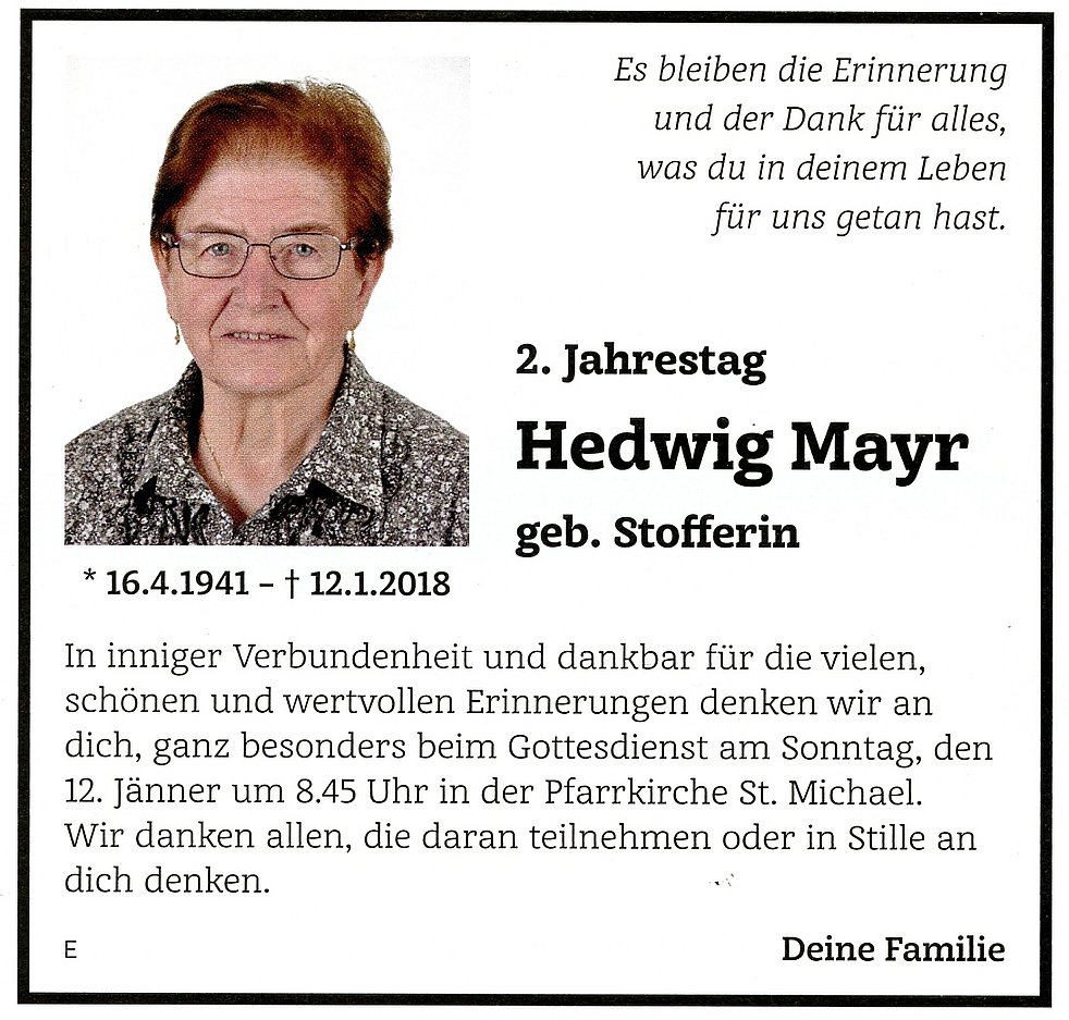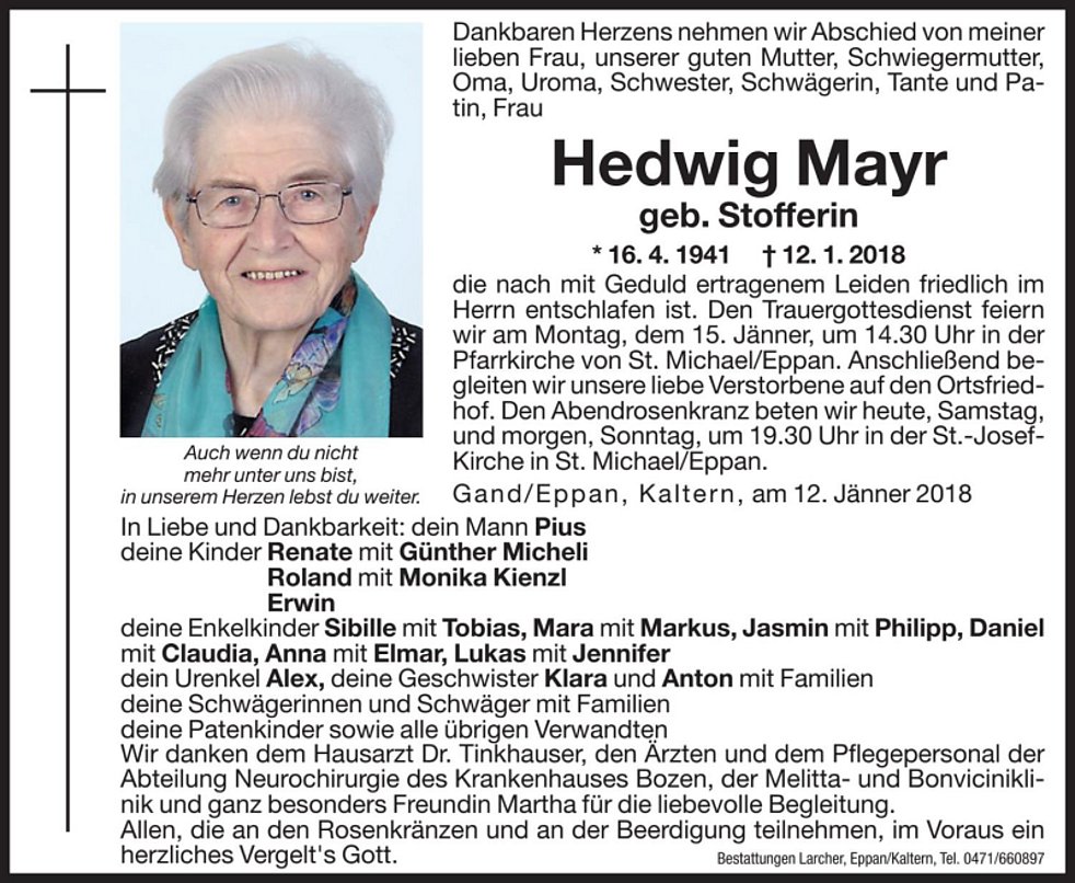 Den Trauergottesdienst feiern wir am Montag, dem 15. Jänner um 14.30 Uhr in der Pfarrkirche von St. Michael/Eppan. Anschließend begleiten wir unsere liebe Verstorbene auf den Ortsfriedhof.