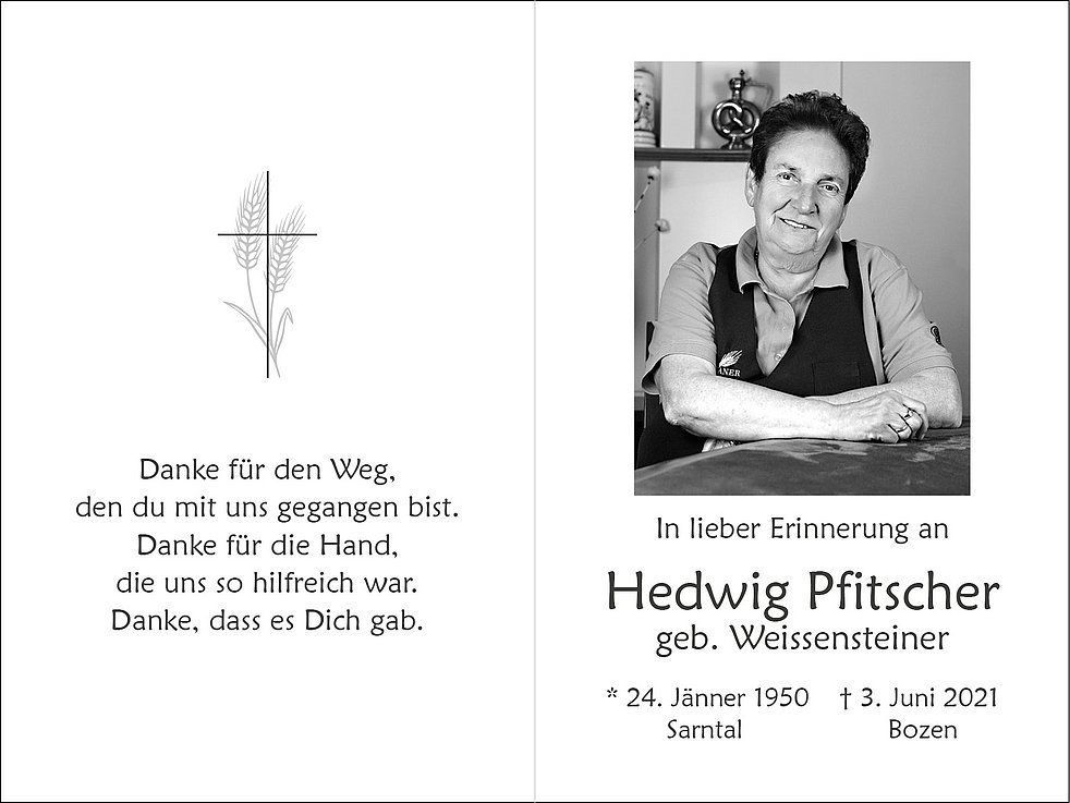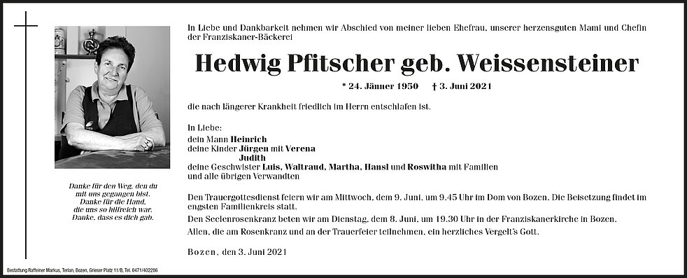Den Trauergottesdienst feiern wir am Mittwoch, dem 9. Juni, um 9.45 Uhr im Dom von Bozen. Die Beisetzung findet im engsten Familienkreis statt.