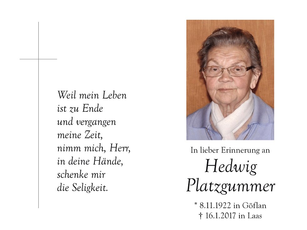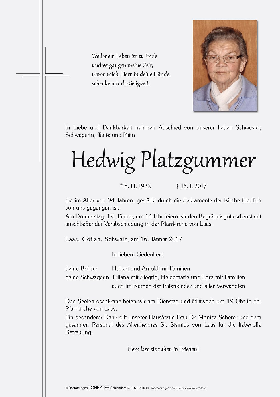 die im Alter von 94 Jahren, gestärkt durch die Sakramente der Kirche friedlich von uns gegangen ist. Am Donnerstag, 19. Jänner, um 14 Uhr feiern wir den Begräbnisgottesdienst mit anschließender Verabschiedung in der Pfarrkirche von Laas.