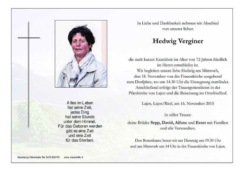 Anschließend erfolgt der Trauergottesdienst in der Pfarrkirche von Lajen und die Beisetzung im Ortsfriedhof.