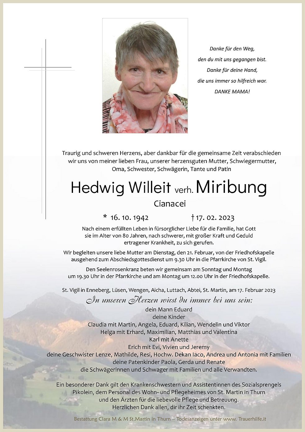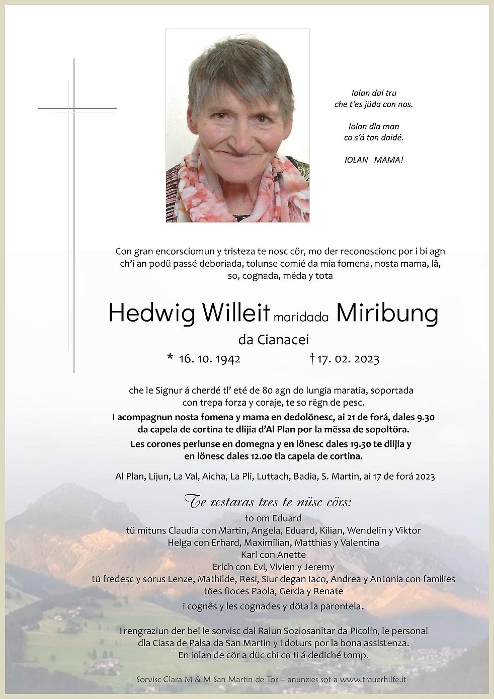 Wir begleiten unsere liebe Mutter am Dienstag, den 21. Februar, von der Friedhofskapelle ausgehend zum Abschiedsgottesdienst um 9.30 Uhr in die Pfarrkirche von St. Vigil.