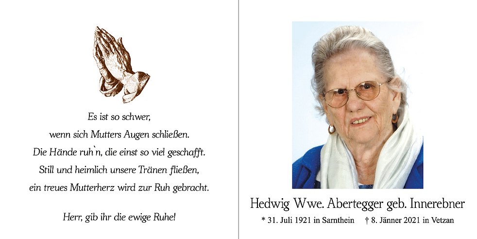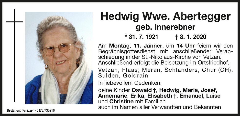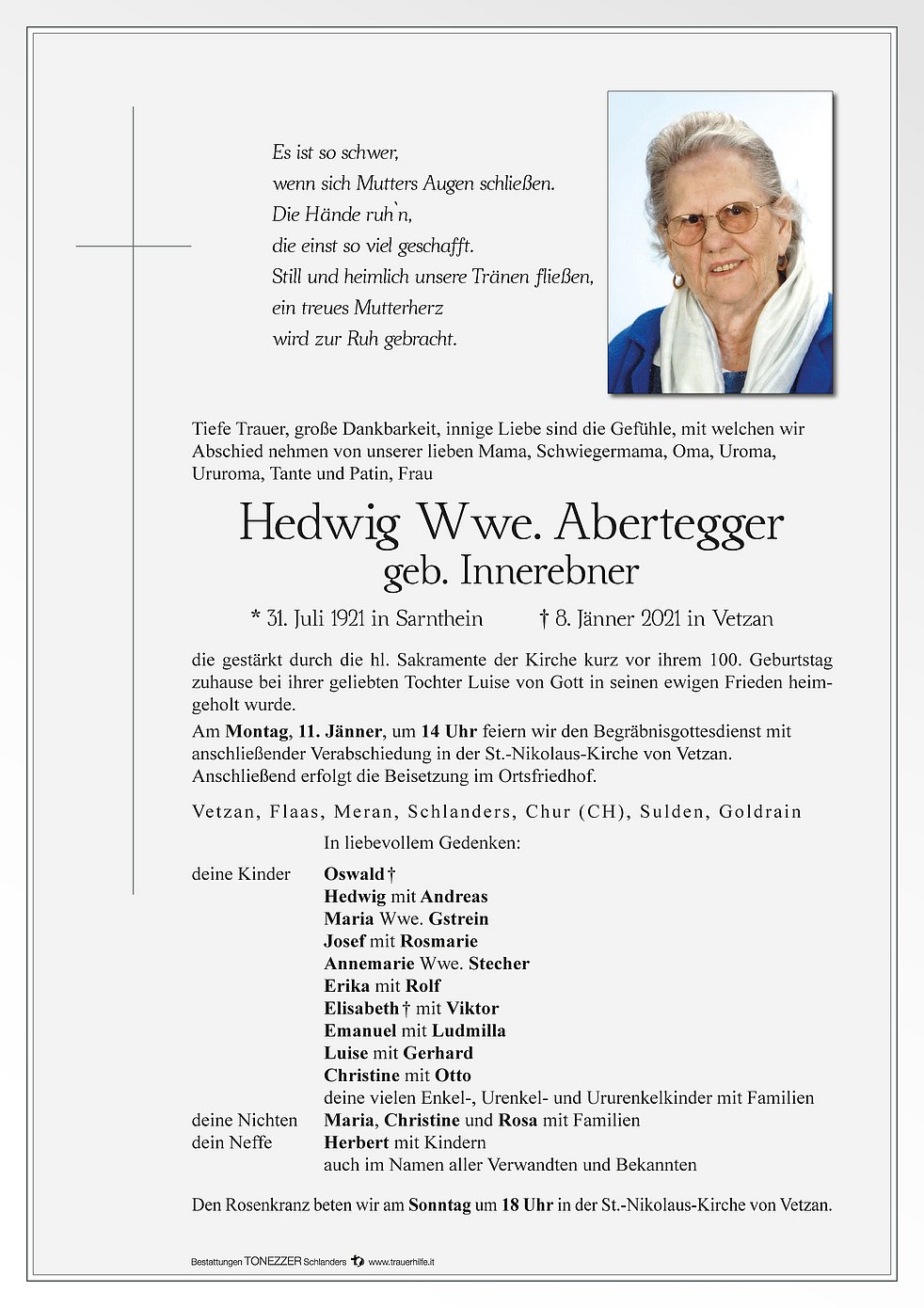 Am Montag, 11. Jänner, um 14 Uhr feiern wir den Begräbnisgottesdienst mit anschließender Verabschiedung in der St.-Nikolaus-Kirche von Vetzan.