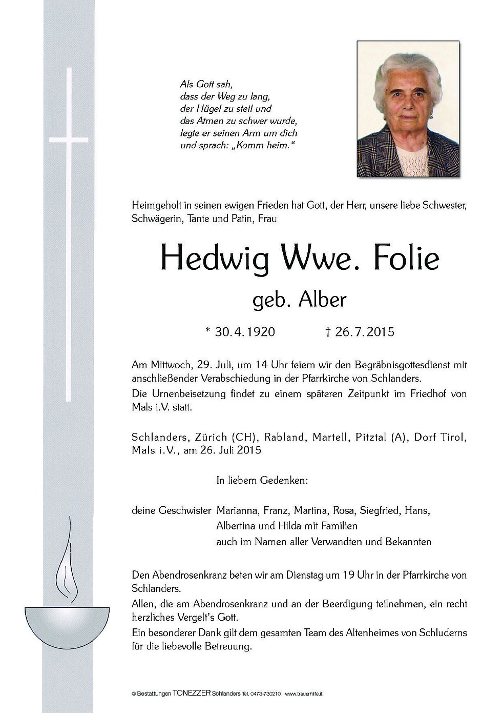 Am Mittwoch, 29. Juli, um 14 Uhr feiern wir den Begräbnisgottesdienst mit anschließender Verabschiedung in der Pfarrkirche von Schlanders.