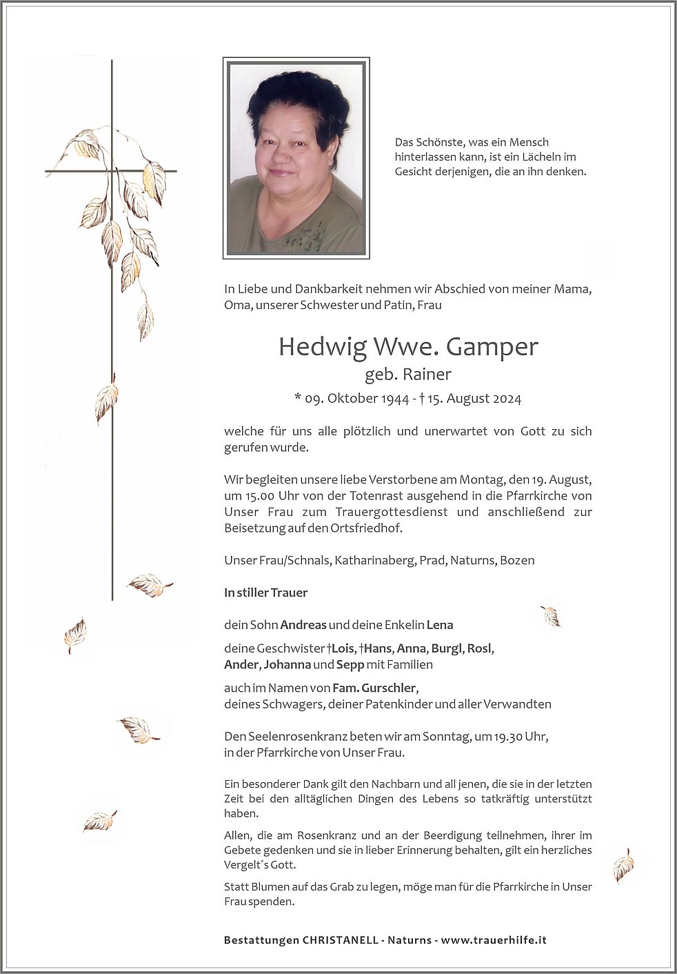 Wir begleiten unsere liebe Verstorbene am Montag, den 19. August, um 15.00 Uhr von der Totenrast ausgehend in die Pfarrkirche von Unser Frau zum Trauergottesdienst und anschließend zur Beisetzung auf den Ortsfriedhof.