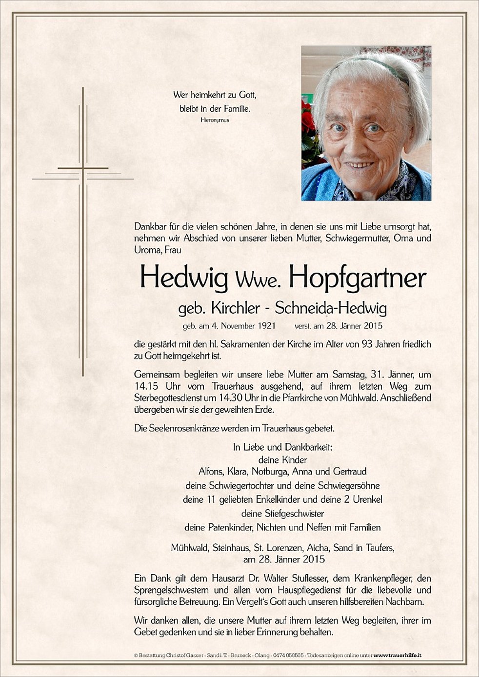 Gemeinsam begleiten wir unsere liebe Mutter am Samstag, 31. Jänner, um 14.15 Uhr vom Trauerhaus ausgehend, auf ihrem letzten Weg zum Sterbegottesdienst um 14.30 Uhr in die Pfarrkirche von Mühlwald. Anschließend übergeben wir sie der geweihten Erde.