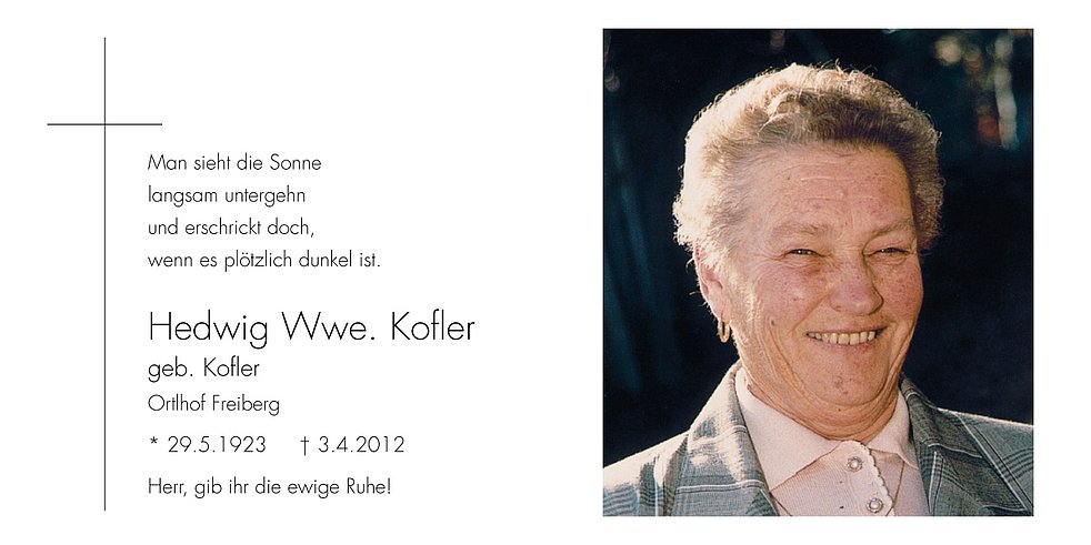 Wir begleiten unsere liebe Mutter am Karsamstag, 7. April, um 12.30 Uhr vom Trauerhaus (Ortlhof) aus zur Einsegnung um 14 Uhr zur Karpophorus-Kirche und anschließend zur Beerdigung auf den Friedhof von Tarsch.