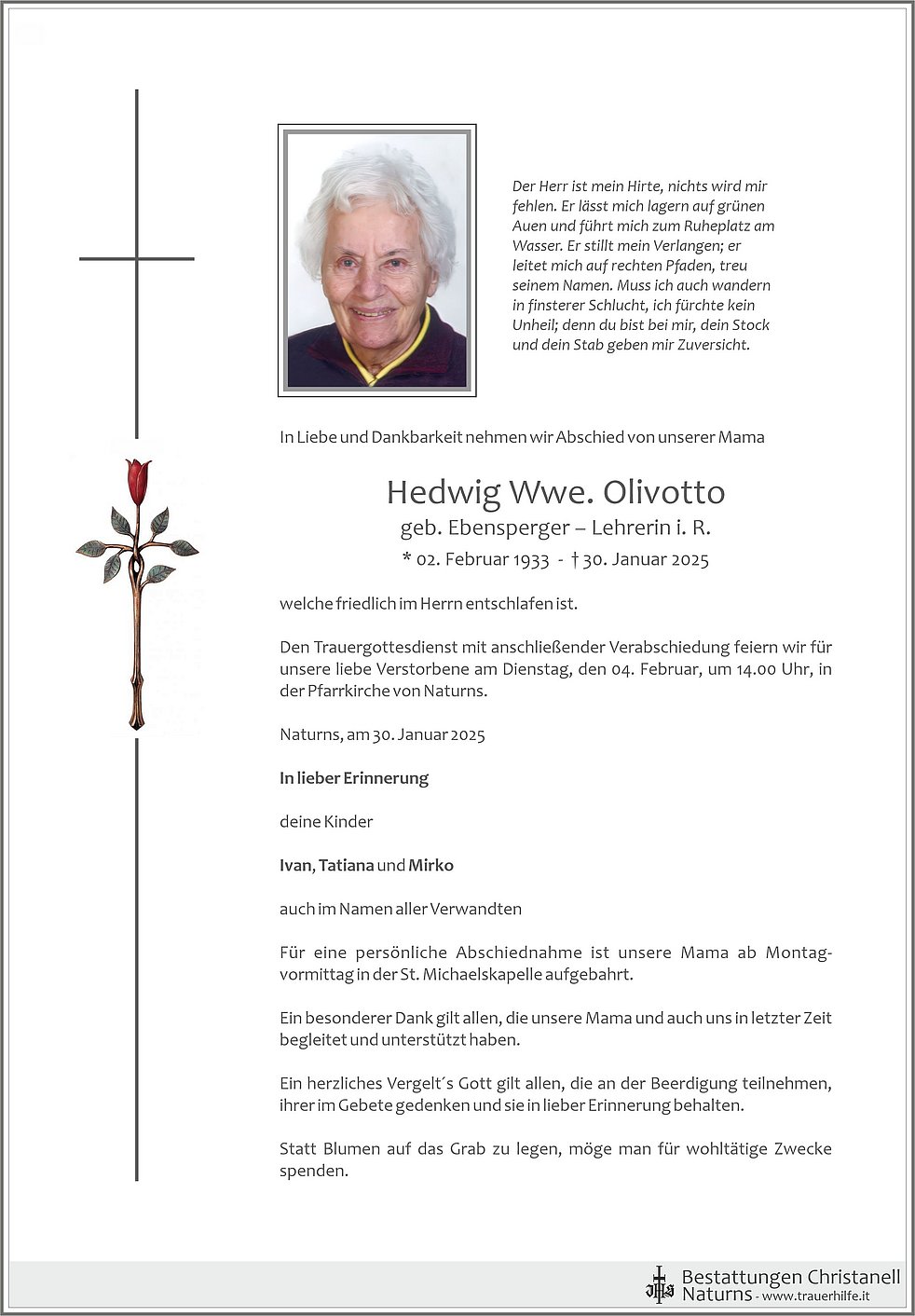 Den Trauergottesdienst mit anschließender Verabschiedung feiern wir für unsere liebe Verstorbene am Dienstag, den 04. Februar, um 14.00 Uhr, in der Pfarrkirche von Naturns.