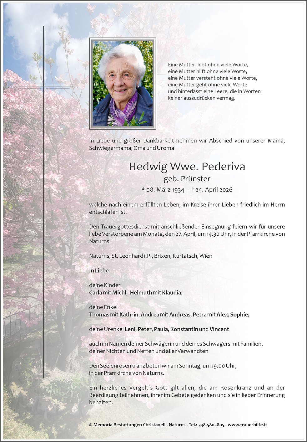 Den Trauergottesdienst mit anschließender Einsegnung feiern wir für unsere liebe Verstorbene am Monatg, den 27. April, um 14.30 Uhr, in der Pfarrkirche von Naturns.