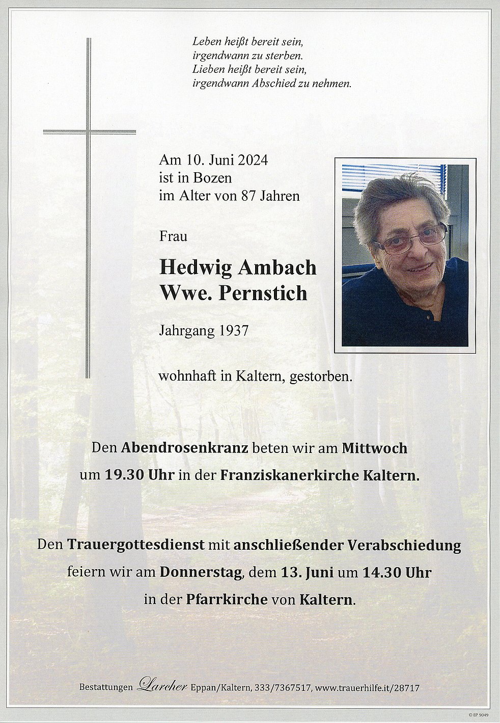 Den Trauergottesdienst mit anschließender Verabschiedung feiern wir am Donnerstag, dem 13. Juni um 14.30 Uhr in der Pfarrkirche von Kaltern.