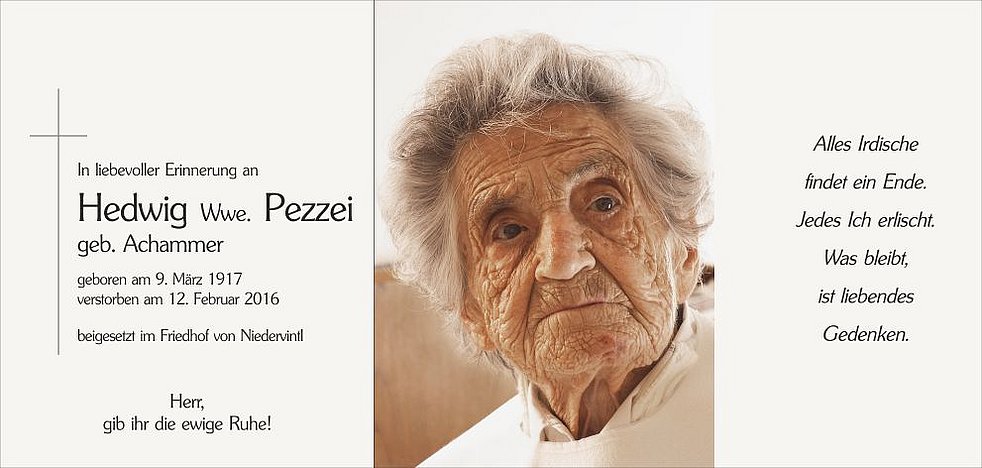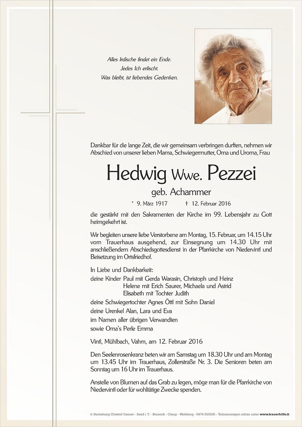 Wir begleiten unsere liebe Verstorbene am Montag, 15. Februar, um 14.15 Uhr vom Trauerhaus ausgehend, zur Einsegnung um 14.30 Uhr mit anschließendem Abschiedsgottesdienst in der Pfarrkirche von Niedervintl und Beisetzung im Ortsfriedhof.