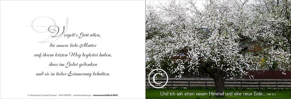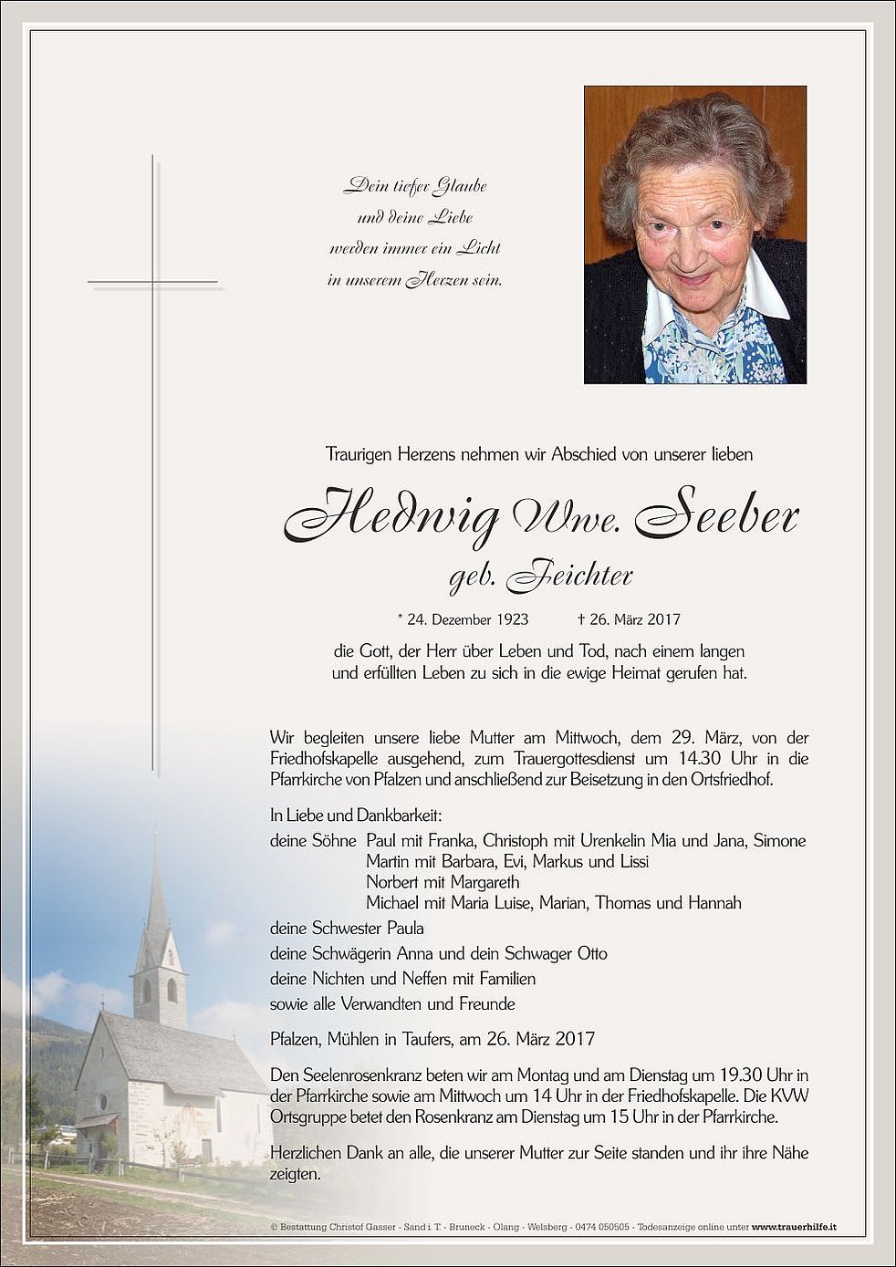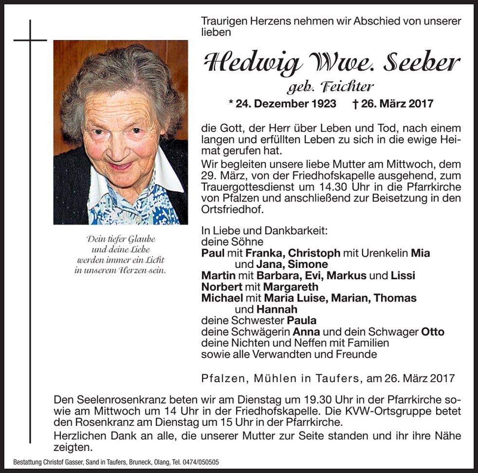Wir begleiten unsere liebe Mutter am Mittwoch, dem 29. März, von der Friedhofskapelle ausgehend, zum Trauergottesdienst um 14.30 Uhr in die Pfarrkirche von Pfalzen und anschließend zur Beisetzung in den Ortsfriedhof.