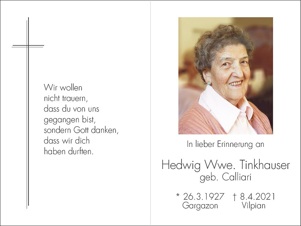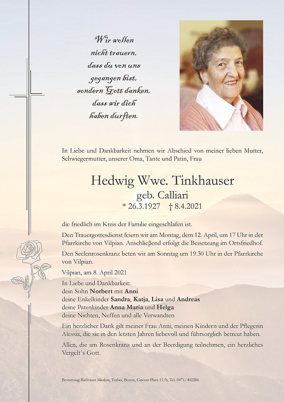 Den Trauergottesdienst feiern wir am Montag, dem 12. April, um 17 Uhr in der Pfarrkirche von Vilpian. Anschlieβend erfolgt die Beisetzung im Ortsfriedhof.