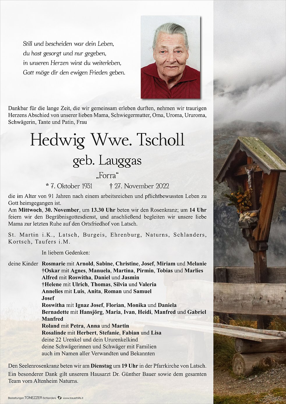 Am Mittwoch, 30. November, um 13.30 Uhr beten wir den Rosenkranz; um 14 Uhr feiern wir den Begräbnisgottesdienst, und anschließend begleiten wir unsere liebe Mama zur letzten Ruhe auf den Ortsfriedhof von Latsch.