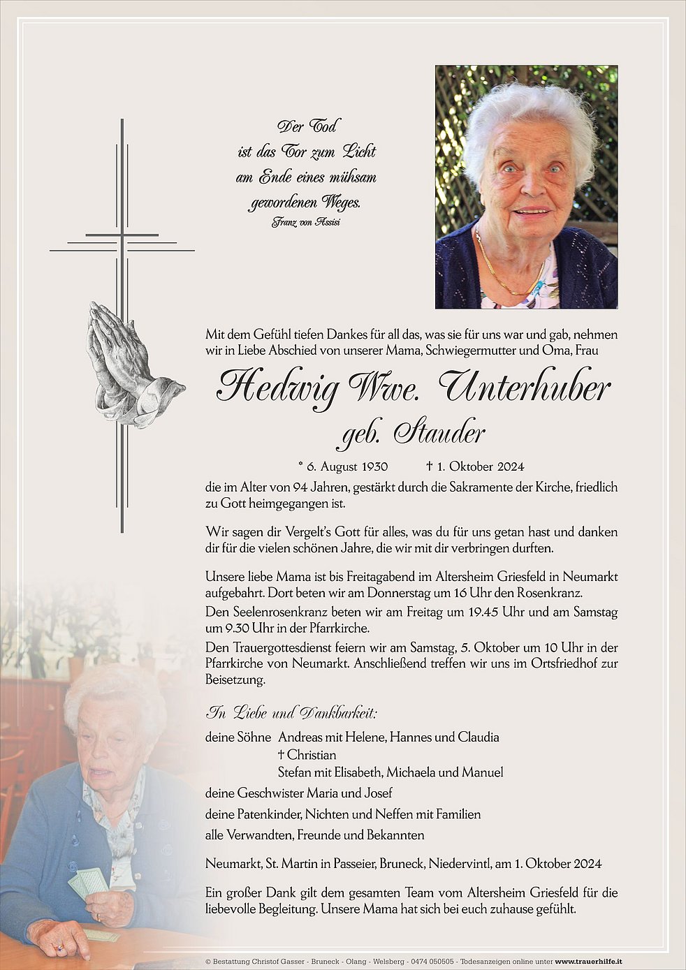 Den Trauergottesdienst feiern wir am Samstag, 5. Oktober um 10 Uhr in der Pfarrkirche von Neumarkt. Anschließend treffen wir uns im Ortsfriedhof zur Beisetzung.