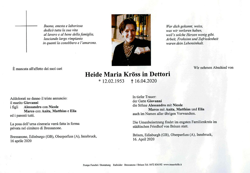 La posa dell’urna cineraria verrà fatta in forma privata nel cimitero di Bressanone.