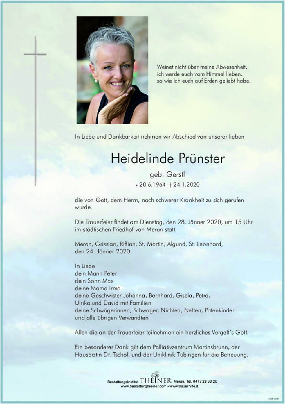 Die Trauerfeier findet am Dienstag, den 28. Jänner 2020, um 15 Uhr im städtischen Friedhof von Meran statt.