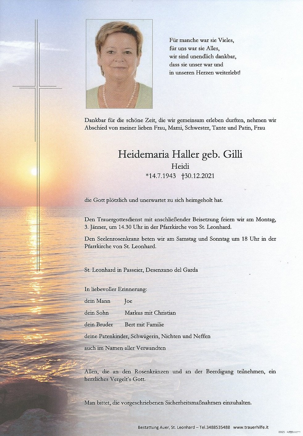 Den Trauergottesdienst mit anschließender Beisetzung feiern wir am Montag, 3. Jänner, um 14.30 Uhr in der Pfarrkirche von St. Leonhard.