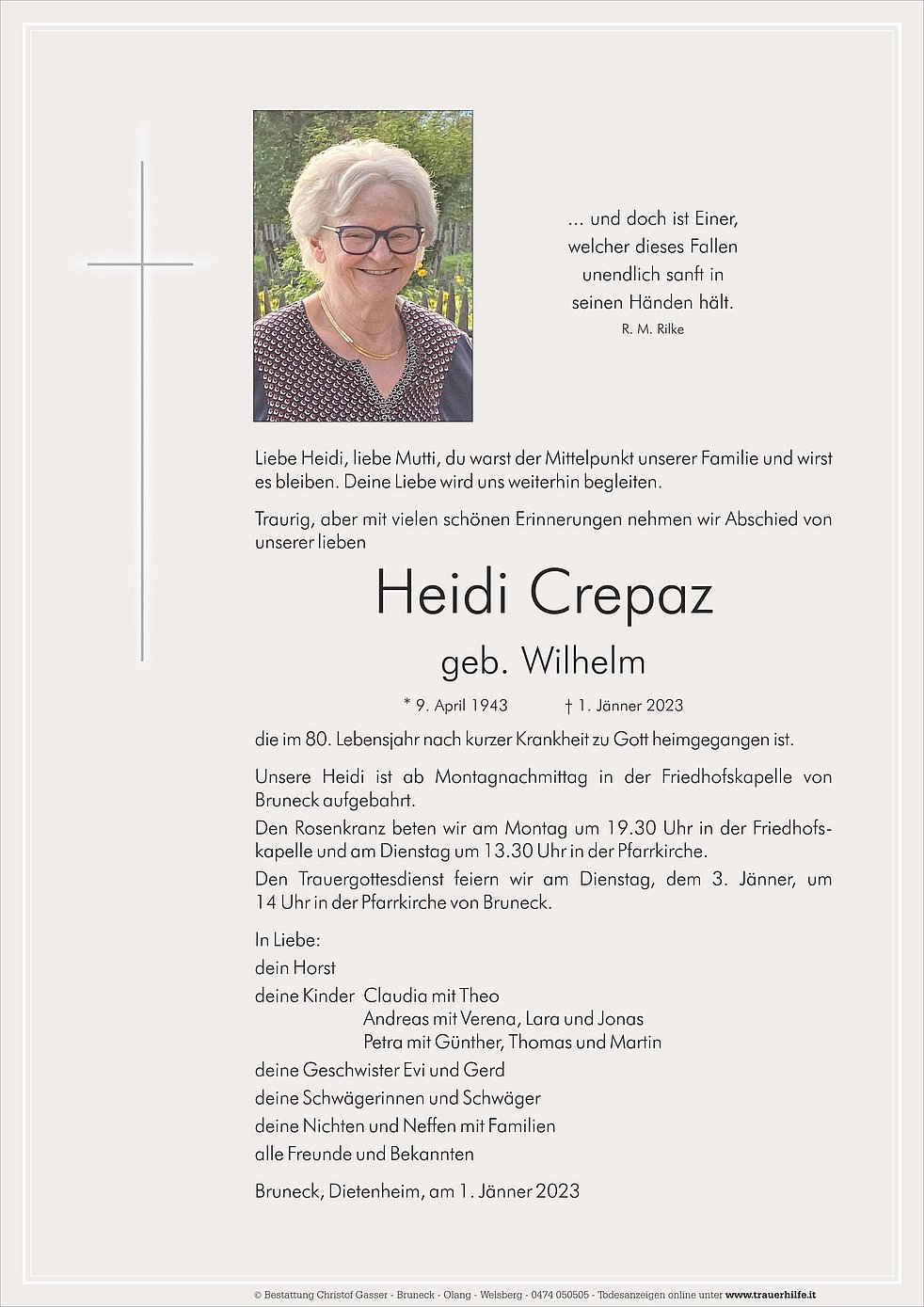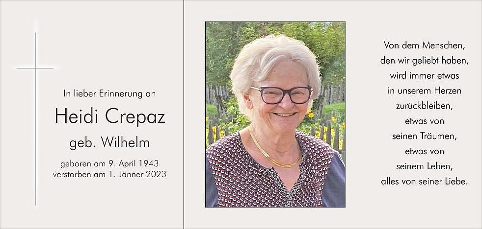 Liebe Heidi, liebe Mutti, du warst der Mittelpunkt unserer Familie und wirst es bleiben. Deine Liebe wird uns weiterhin begleiten.
