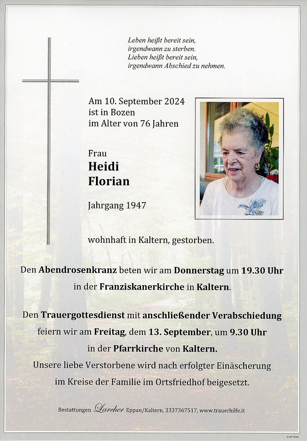 Den Trauergottesdienst mit anschließender Verabschiedung feiern wir am Freitag, dem 13. September um 9.30 Uhr in der Pfarrkirche von Kaltern.