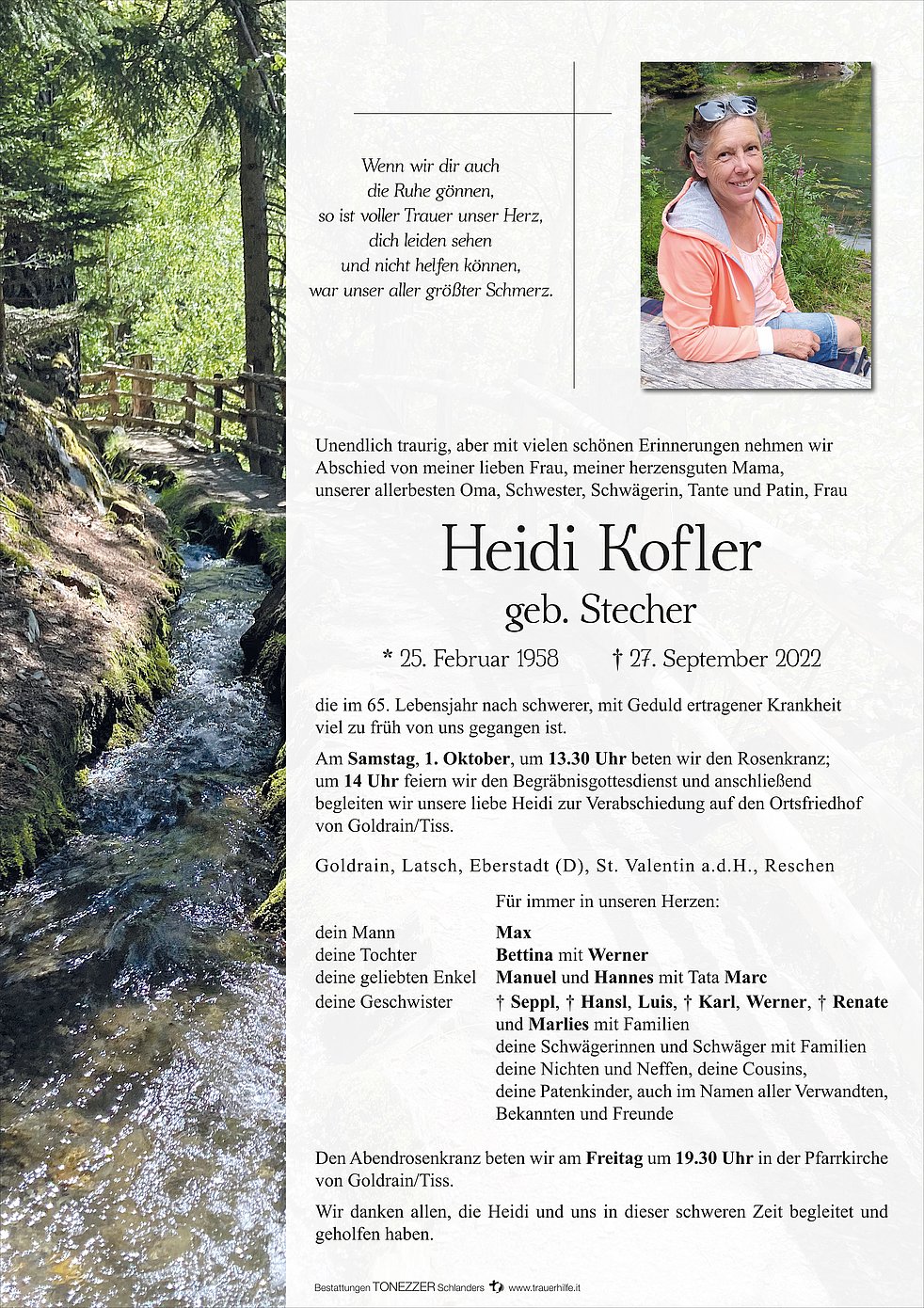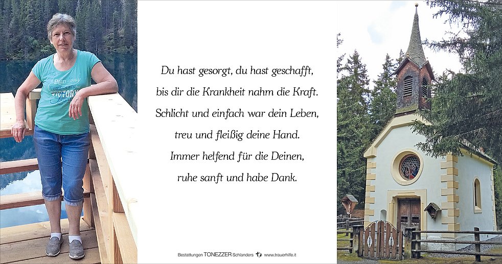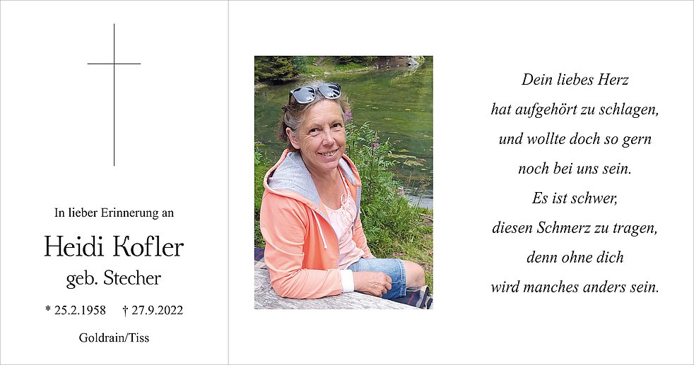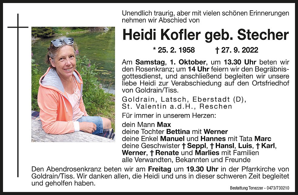 Am Samstag, 1. Oktober, um 13.30 Uhr beten wir den Rosenkranz; um 14 Uhr feiern wir den Begräbnisgottesdienst und anschließend begleiten wir unsere liebe Heidi zur Verabschiedung auf den Ortsfriedhof von Goldrain/Tiss.