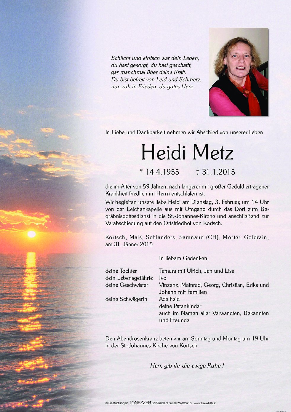 Wir begleiten unsere liebe Heidi am Dienstag, 3. Februar, um 14 Uhr von der Leichenkapelle aus mit Umgang durch das Dorf zum Begräbnisgottesdienst in die St.-Johannes-Kirche und anschließend zur Verabschiedung auf den Ortsfriedhof von Kortsch.