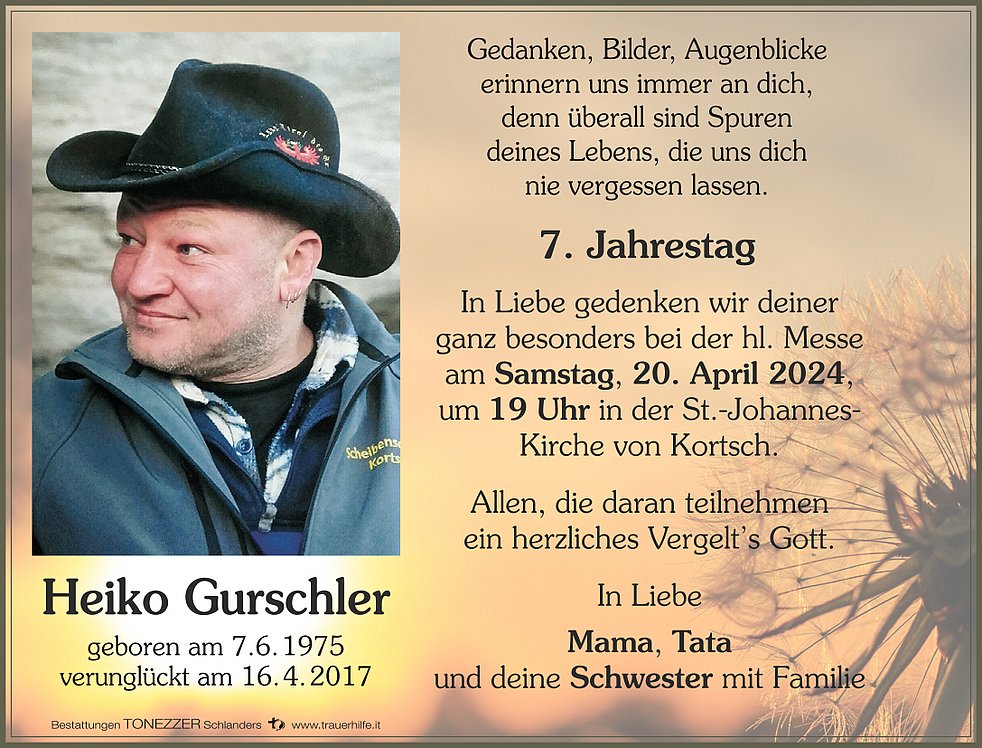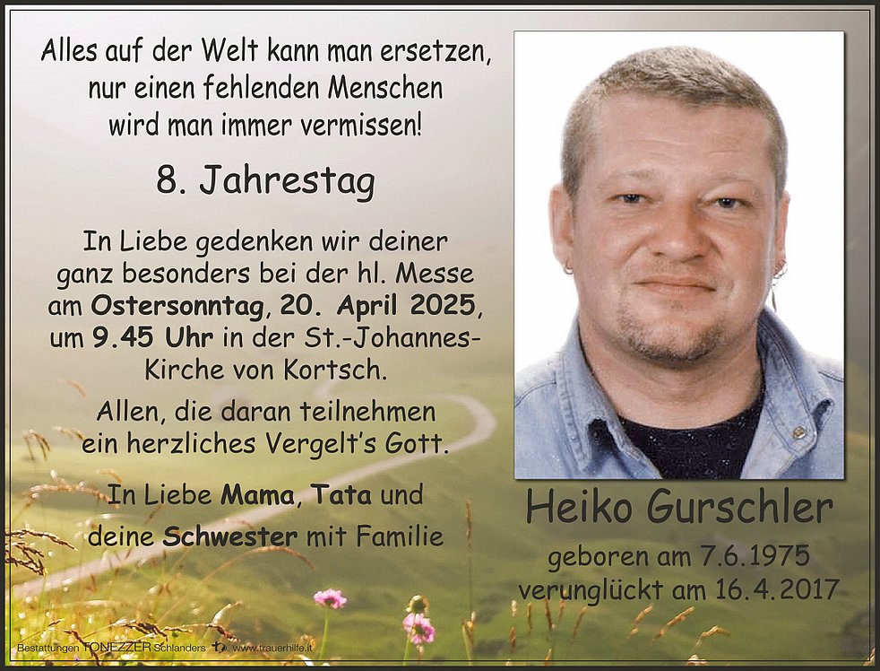 Wir begleiten unseren lieben Heiko am Donnerstag, 20. April, um 14 Uhr vom Trauerhaus (St. Ägidiusweg 21) aus zum Begräbnisgottesdienst in die St.-Johannes-Kirche und anschließend zur letzten Ruhe auf den Ortsfriedhof von Kortsch.