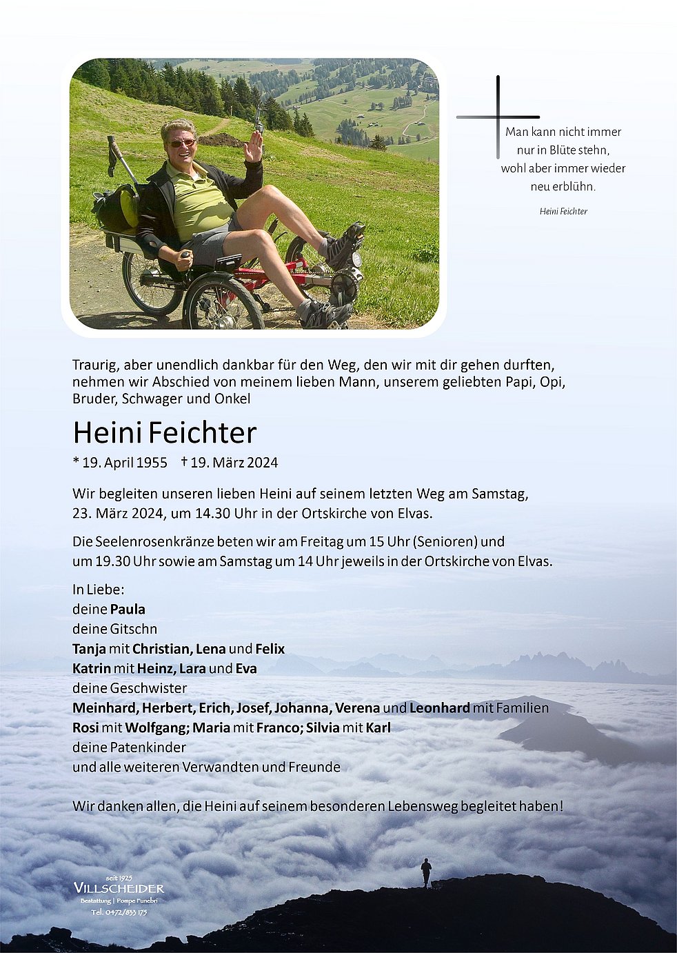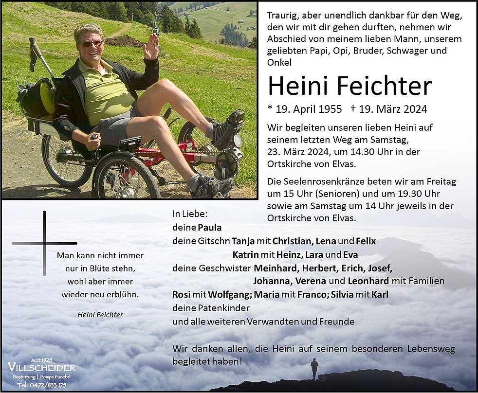 An die Familie von Heini Feichter. Ein Herzliches Beileid von Familie Werner Albrecht mit Christine Feichter, Lisa & Michael- Naturns.