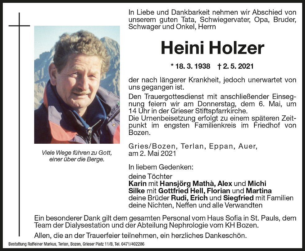 Die Urnenbeisetzung erfolgt zu einem späteren Zeitpunkt im engsten Familienkreis im Friedhof von Bozen.