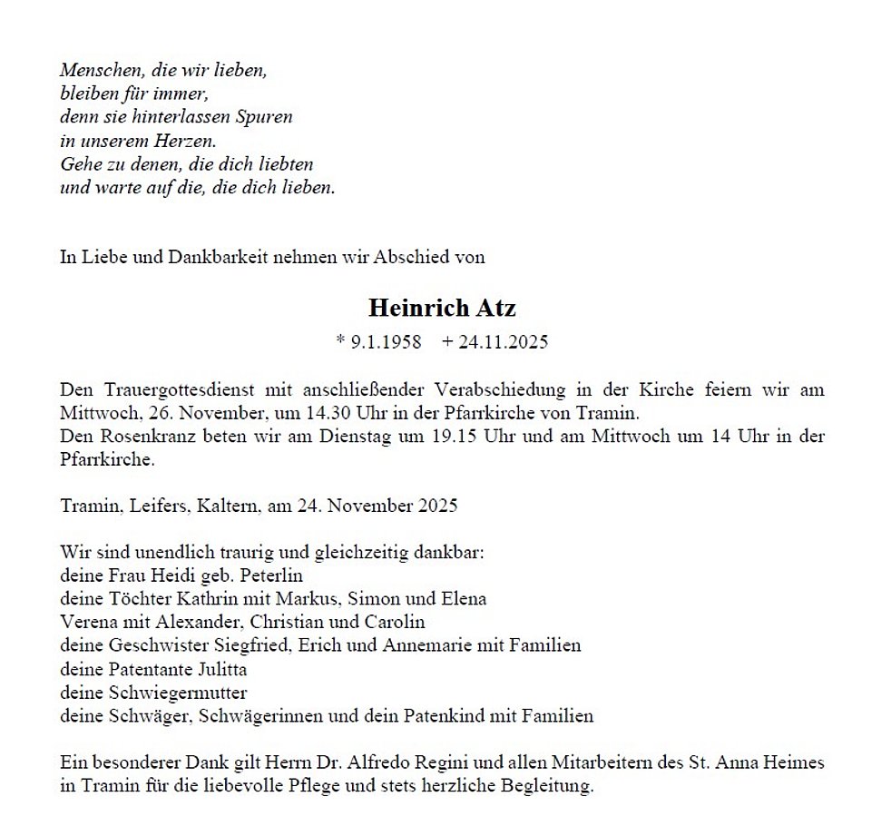 Liebe Heidi, liebe Kathrin und Verena, liebe Trauerfamilie! Unser herzliches Beileid. Wir denken gerne an Heinrich zurück, der vielen als engagierter Fliesenleger und leidenschaftlicher Fußballer in Erinnerung bleiben wird. Den schweren Weg seiner Krankheit und Pflege hat er gemeinsam mit dir liebe Heidi und deiner Familie getragen eure Unterstützung war sicher eine große Kraft für ihn. Wir wünschen euch allen in dieser schweren Zeit viel Trost, Stärke und liebe Menschen, die euch nahe stehen. Ein stiller Gruß Anneliese Ambach Holzer mit Familie