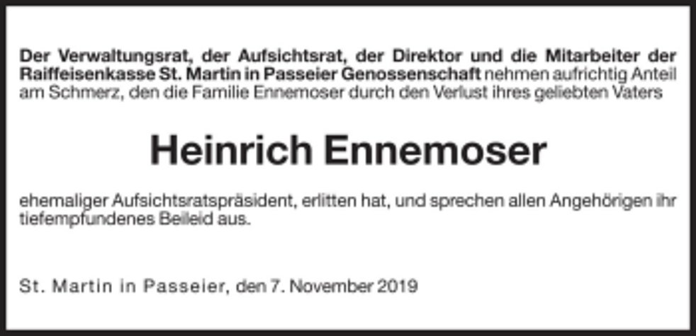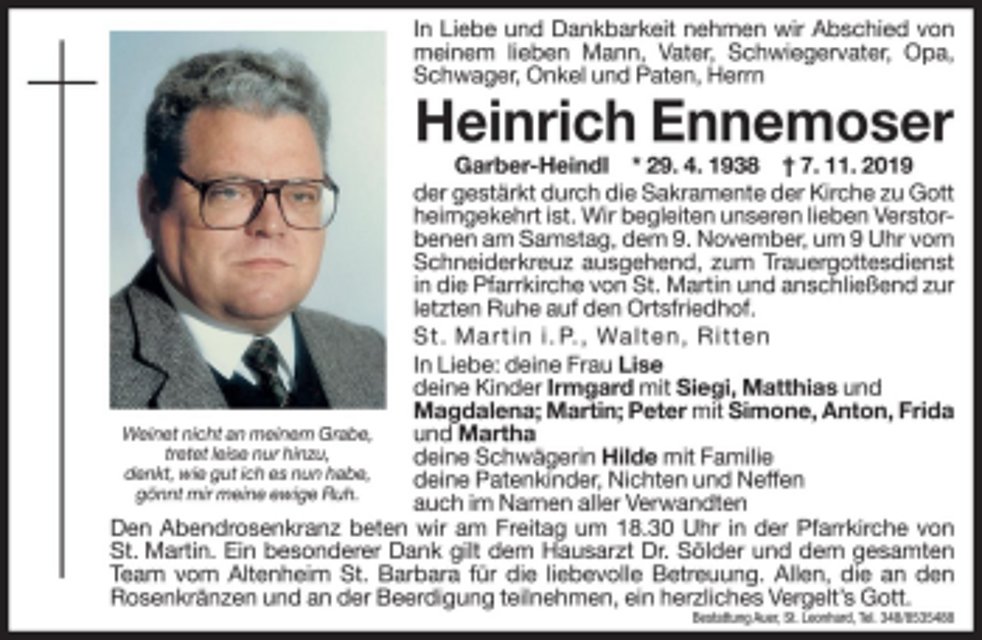 der gestärkt durch die Sakramente der Kirche zu Gott heimgekehrt ist. Wir begleiten unseren lieben Verstorbenen am Samstag, dem 9. November, um 9 Uhr vom Schneiderkreuz ausgehend, zum Trauergottesdienst in die Pfarrkirche von St. Martin und anschließend zur letzten Ruhe auf den Ortsfriedhof.