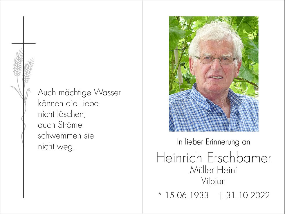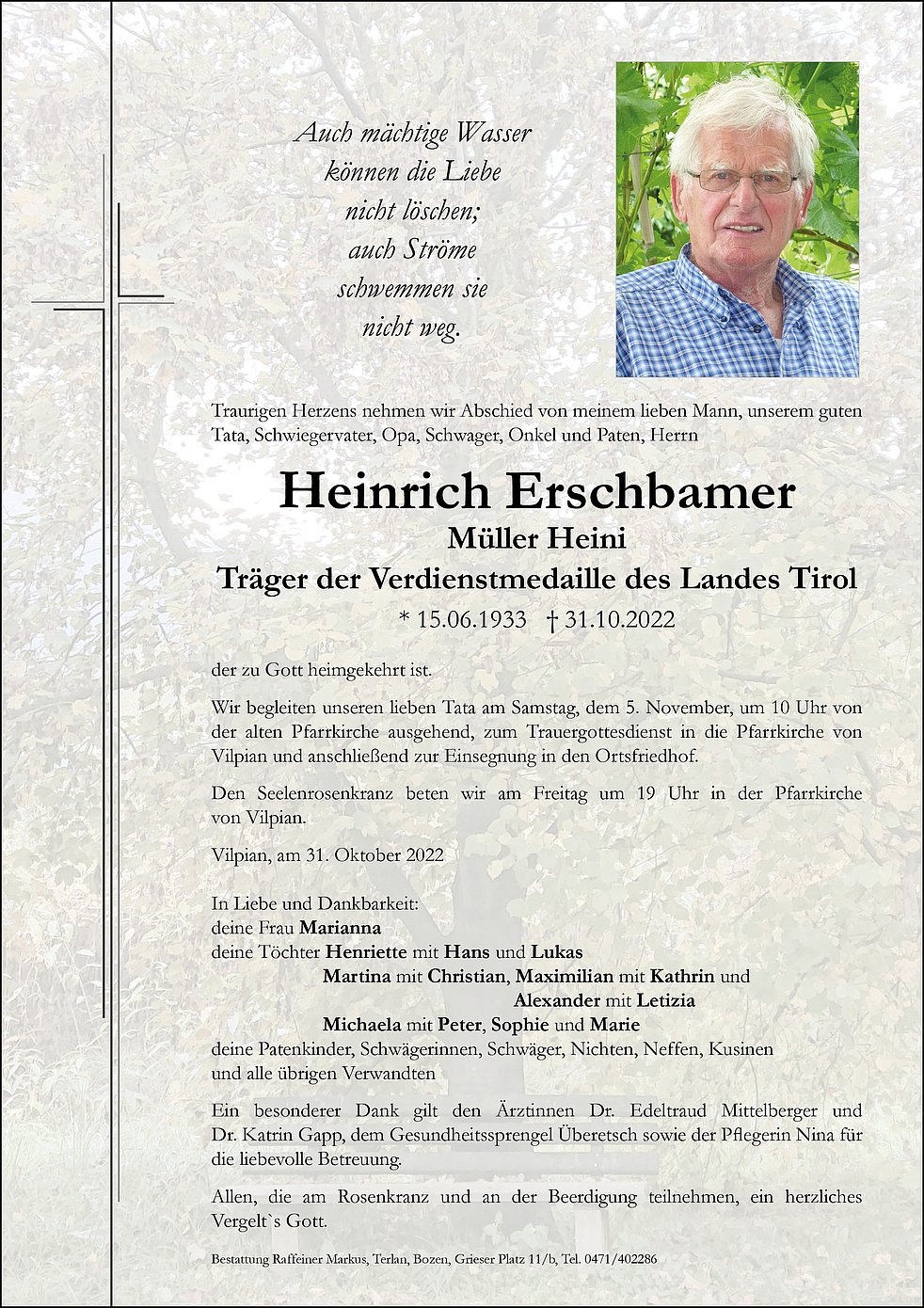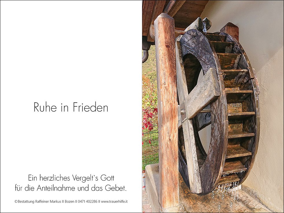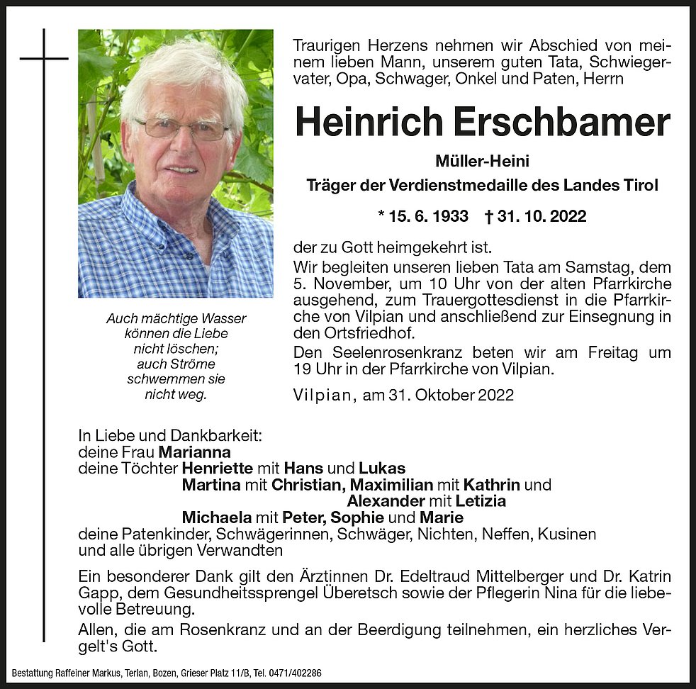 Wir begleiten unseren lieben Tata am Samstag, dem 5. November, um 10 Uhr von der alten Pfarrkirche ausgehend, zum Trauergottesdienst in die Pfarrkirche von Vilpian und anschließend zur Einsegnung in den Ortsfriedhof.