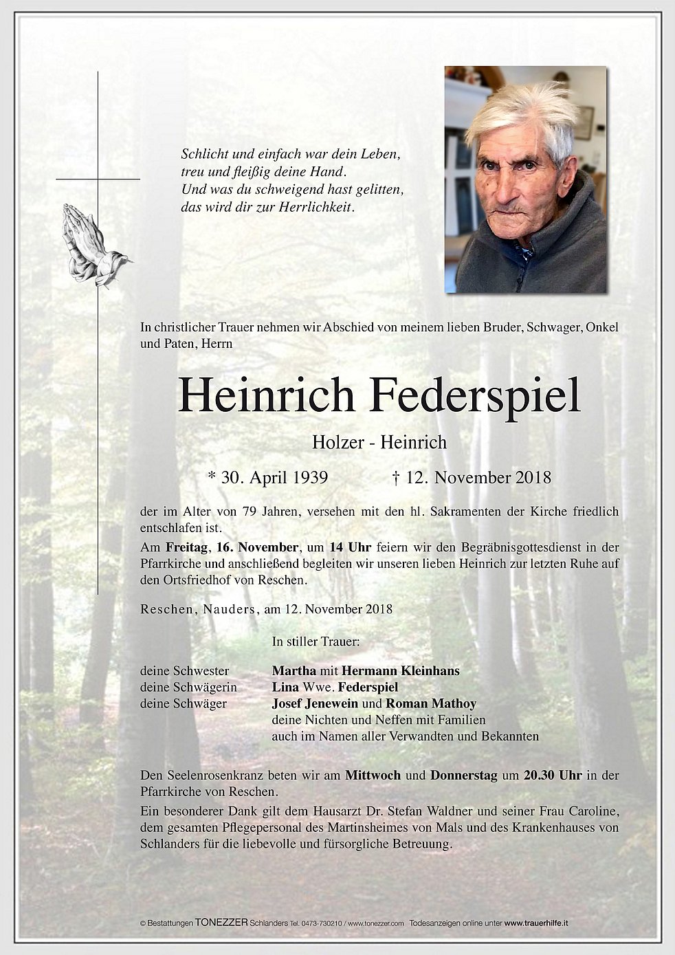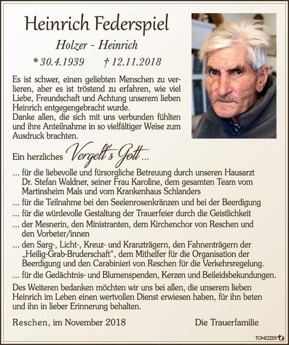Am Freitag, 16. November, um 14 Uhr feiern wir den Begräbnisgottesdienst in der Pfarrkirche und anschließend begleiten wir unseren lieben Heinrich zur letzten Ruhe auf den Ortsfriedhof von Reschen.