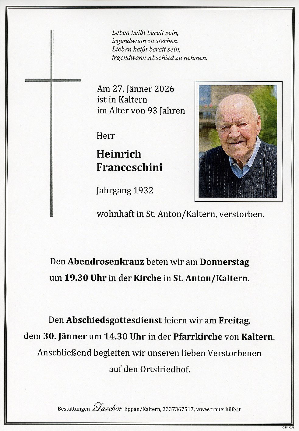 Den Trauergottesdienst feiern wir am Freitag, dem 30. Jänner um 14.30 Uhr in der Pfarrkirche von Kaltern. Anschließend begleiten wir unseren lieben Verstorbenen auf den Ortsfriedhof.