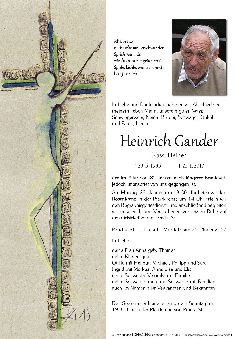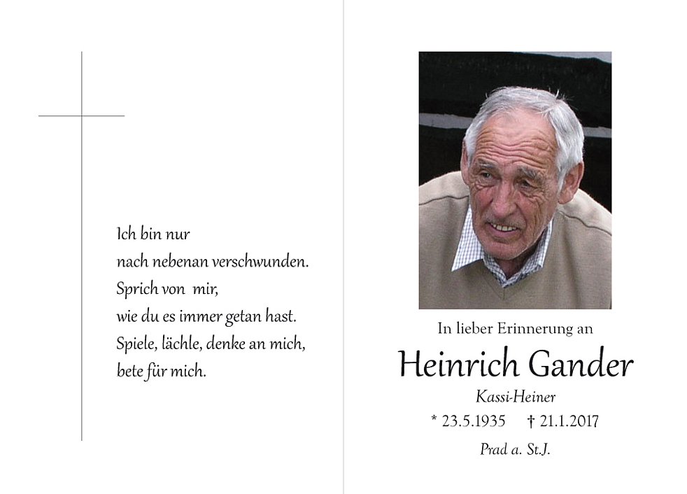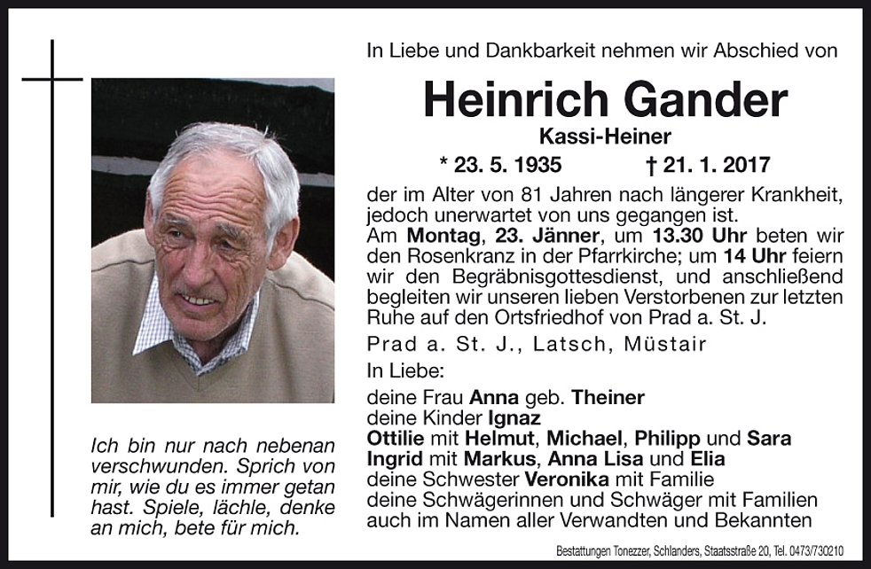 Am Montag, 23. Jänner, um 13.30 Uhr beten wir den Rosenkranz in der Pfarrkirche; um 14 Uhr feiern wir den Begräbnisgottesdienst, und anschließend begleiten wir unseren lieben Verstorbenen zur letzten Ruhe auf den Ortsfriedhof von Prad a.St.J.