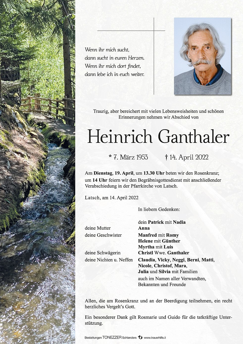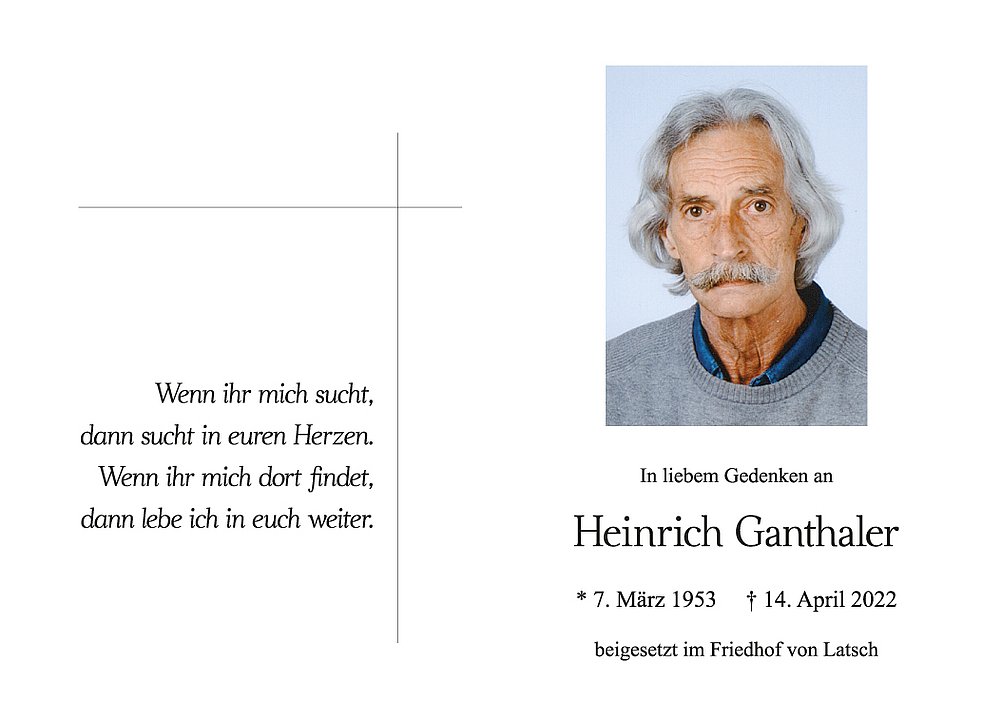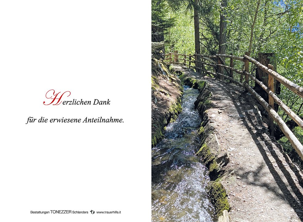 Am Dienstag, 19. April, um 13.30 Uhr beten wir den Rosenkranz; um 14 Uhr feiern wir den Begräbnisgottesdienst mit anschließender Verabschiedung in der Pfarrkirche von Latsch.