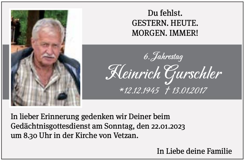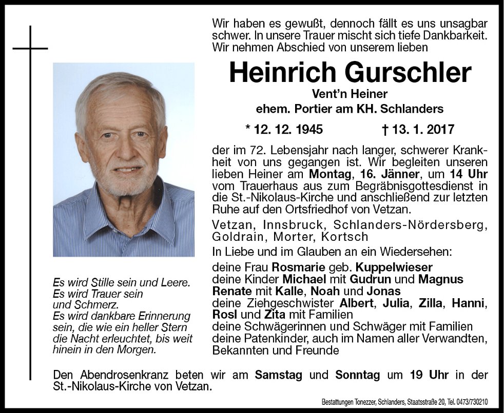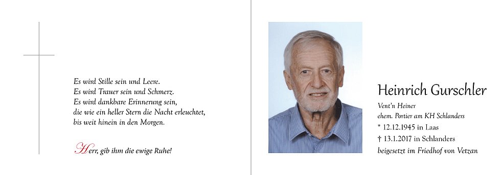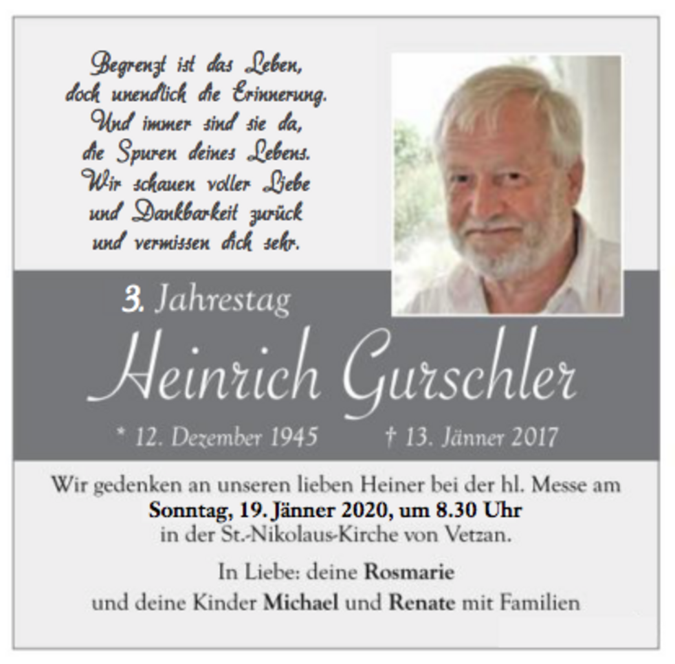Wir begleiten unseren lieben Heiner am Montag, 16. Jänner, um 14 Uhr vom Trauerhaus aus zum Begräbnisgottesdienst in die St.-Nikolaus-Kirche und anschließend zur letzten Ruhe auf den Ortsfriedhof von Vetzan.