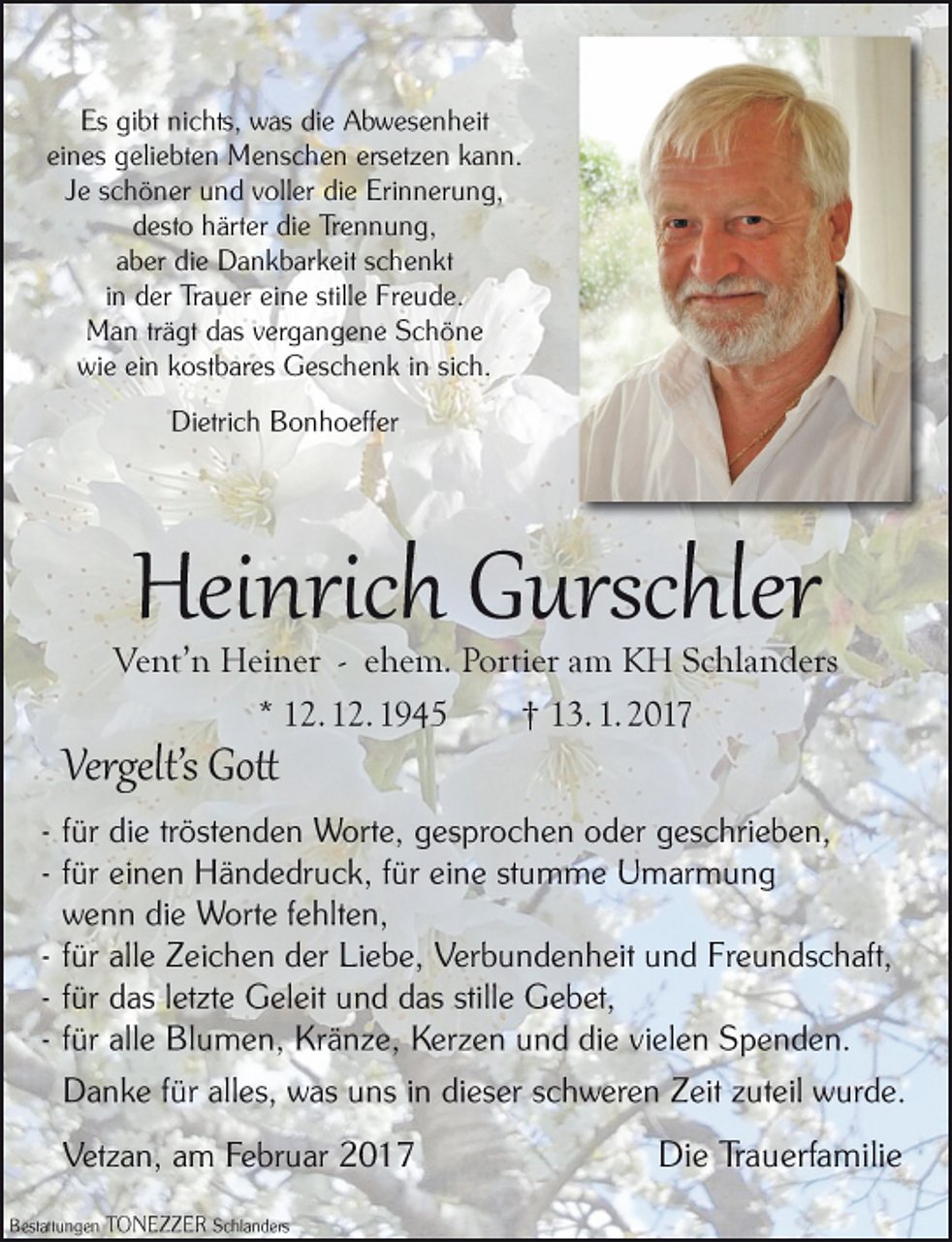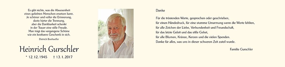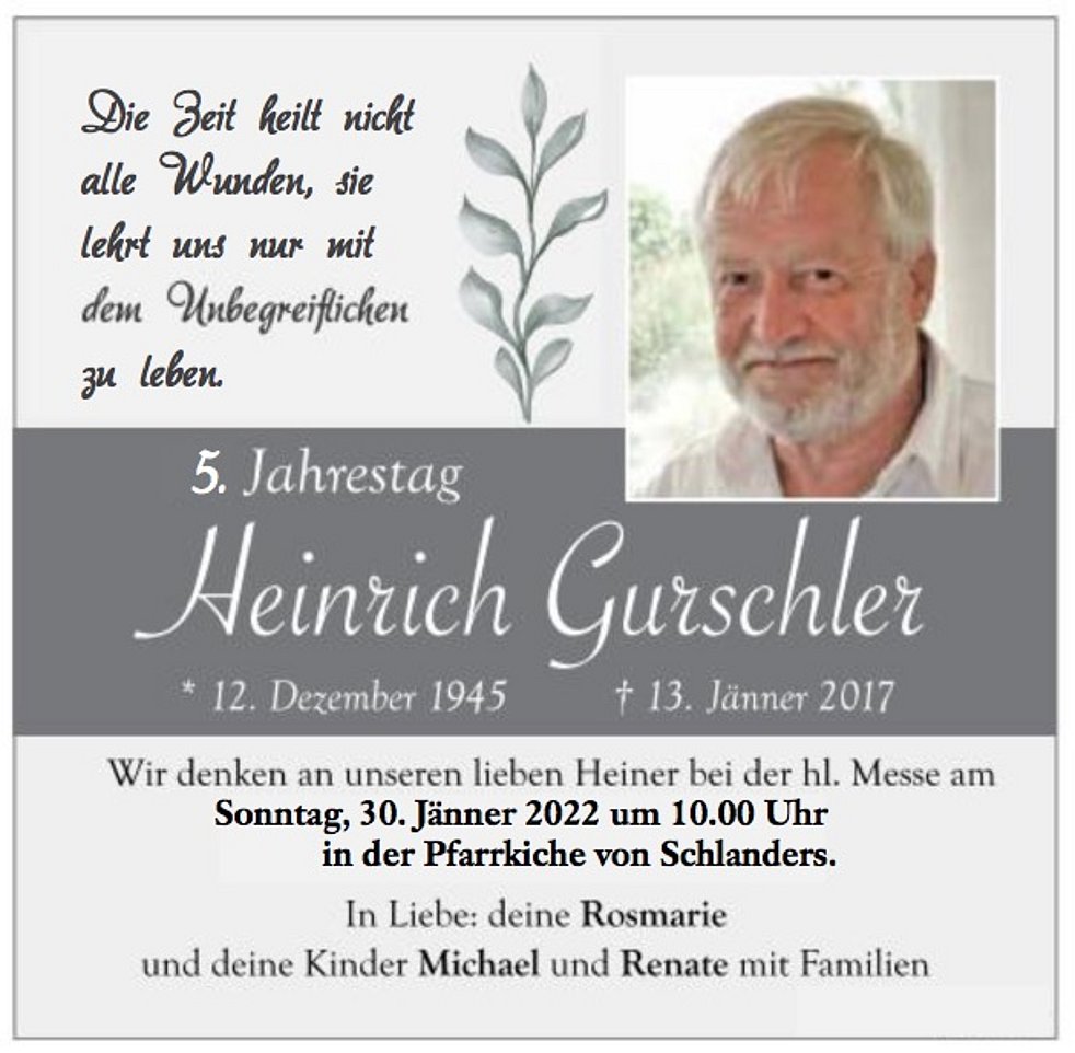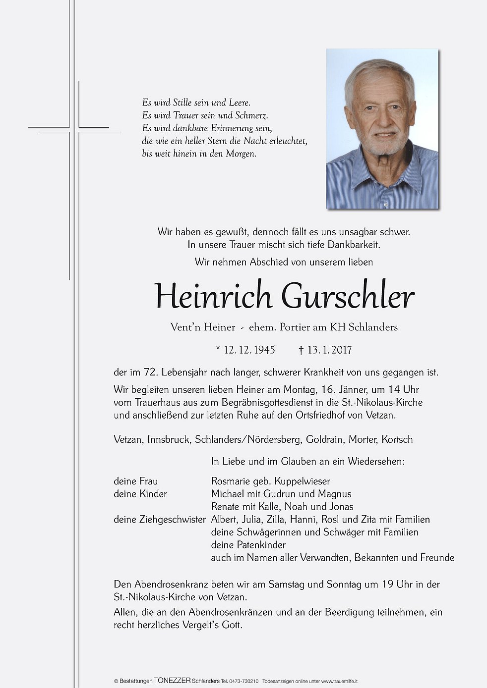 Wir begleiten unseren lieben Heiner am Montag, 16. Jänner, um 14 Uhr vom Trauerhaus aus zum Begräbnisgottesdienst in die St.-Nikolaus-Kirche und anschließend zur letzten Ruhe auf den Ortsfriedhof von Vetzan.