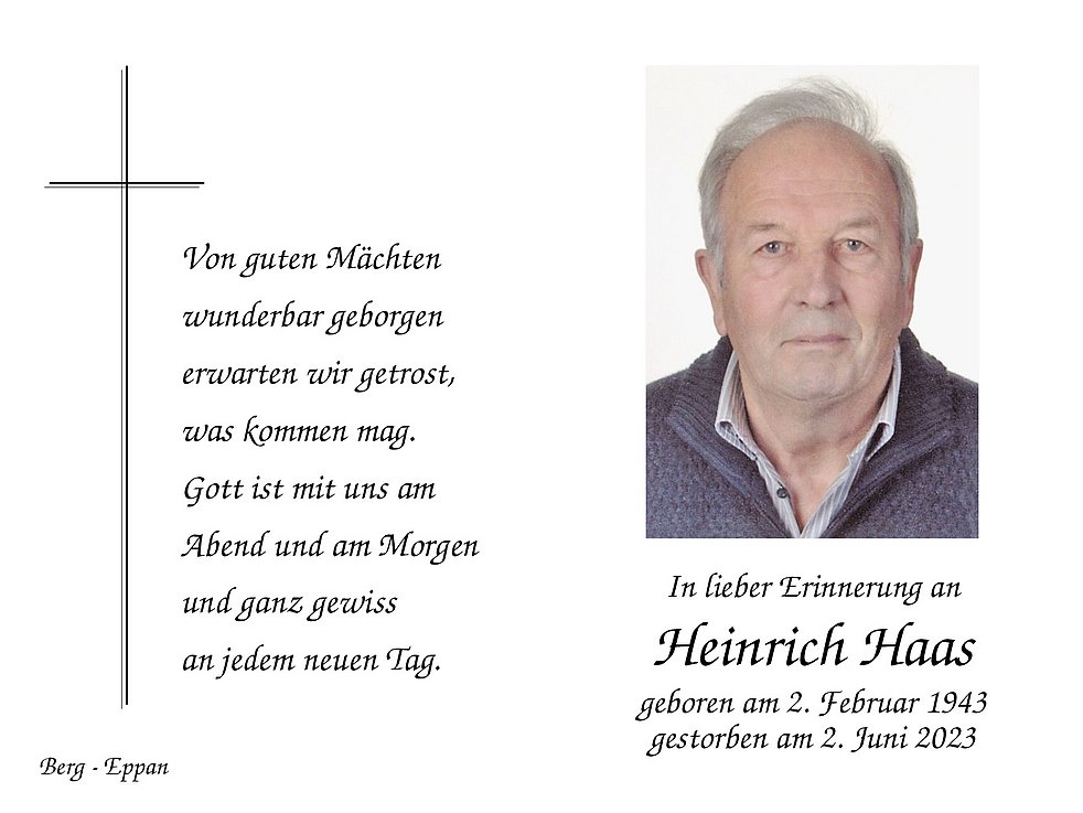 Den Begräbnisgottesdienst feiern wir am Montag, dem 5. Juni, um 14:30 Uhr in der Pfarrkirche von St. Pauls. Anschließend begleiten wir unseren lieben Verstorbenen auf den Ortsfriedhof. Den Abendrosenkranz beten wir am Samstag und am Sonntag um 20 Uhr in der St. Justinakirche in Berg/Eppan.