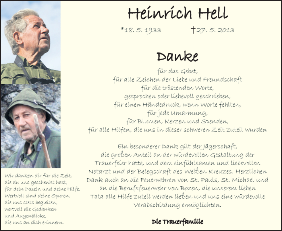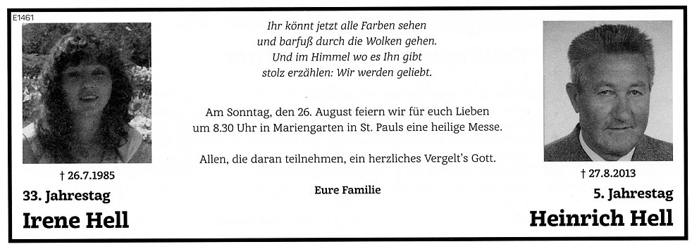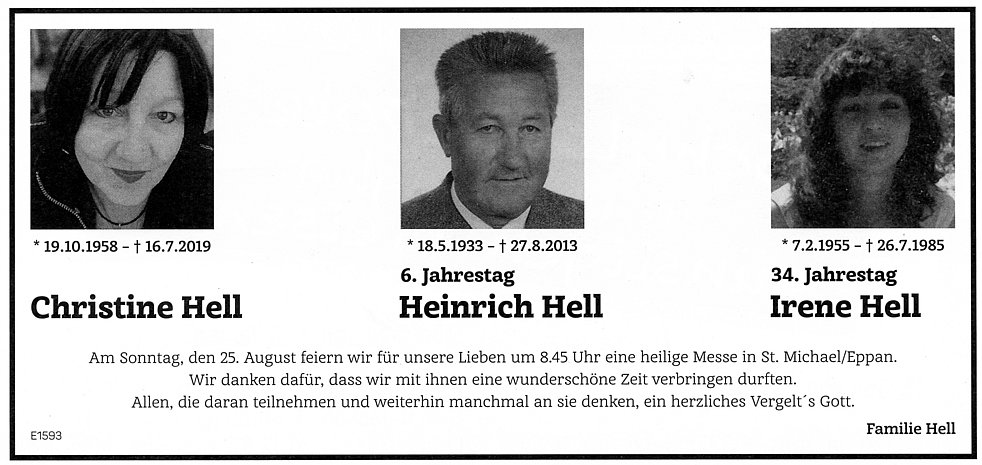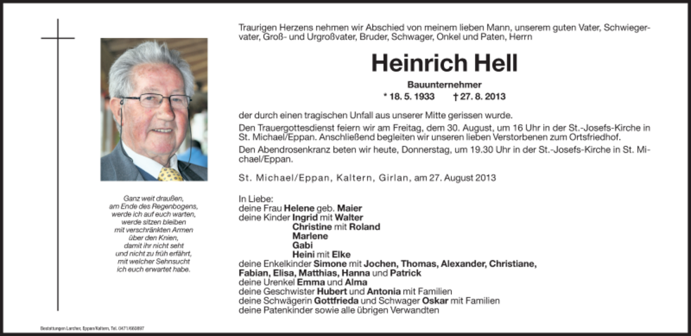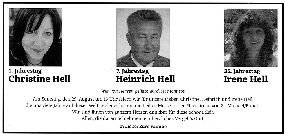 Den Trauergottesdienst feiern wir am Freitag, den 30. August, um 16 Uhr in der St. Josefs – Kirche in St. Michael/Eppan. Anschließend begleiten wir unseren lieben Verstorbenen zum Ortsfriedhof.